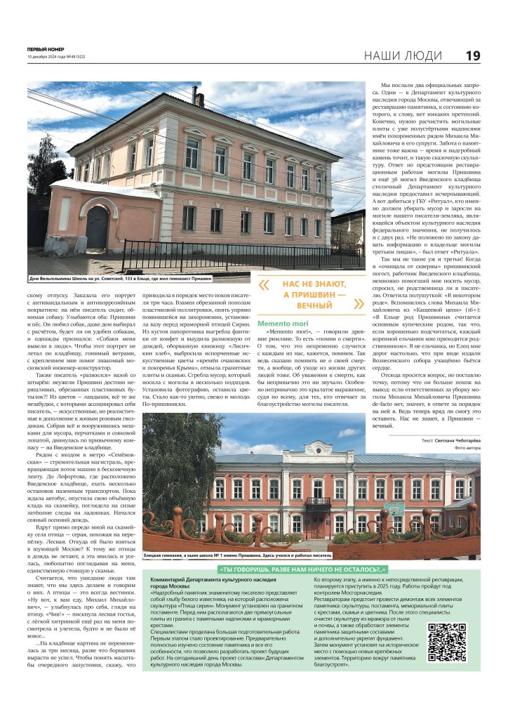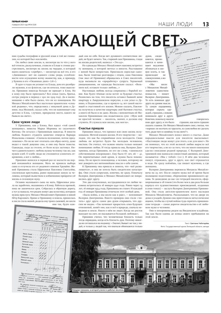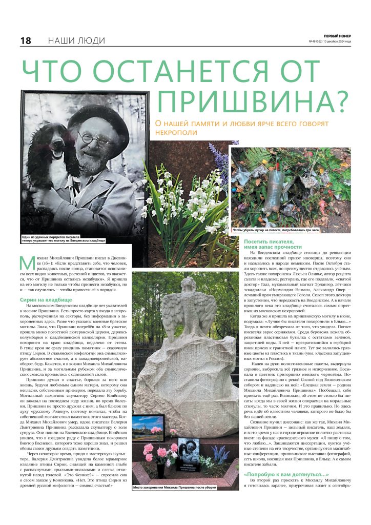Светлана не только пристально изучает жизнь и творчество писателя, но и бережно сохраняет память — именно благодаря ей был наведён порядок на могиле Пришвина в Москве, а власти столицы взяли под особый контроль кладбище в Лефортове, где похоронен наш великий земляк.