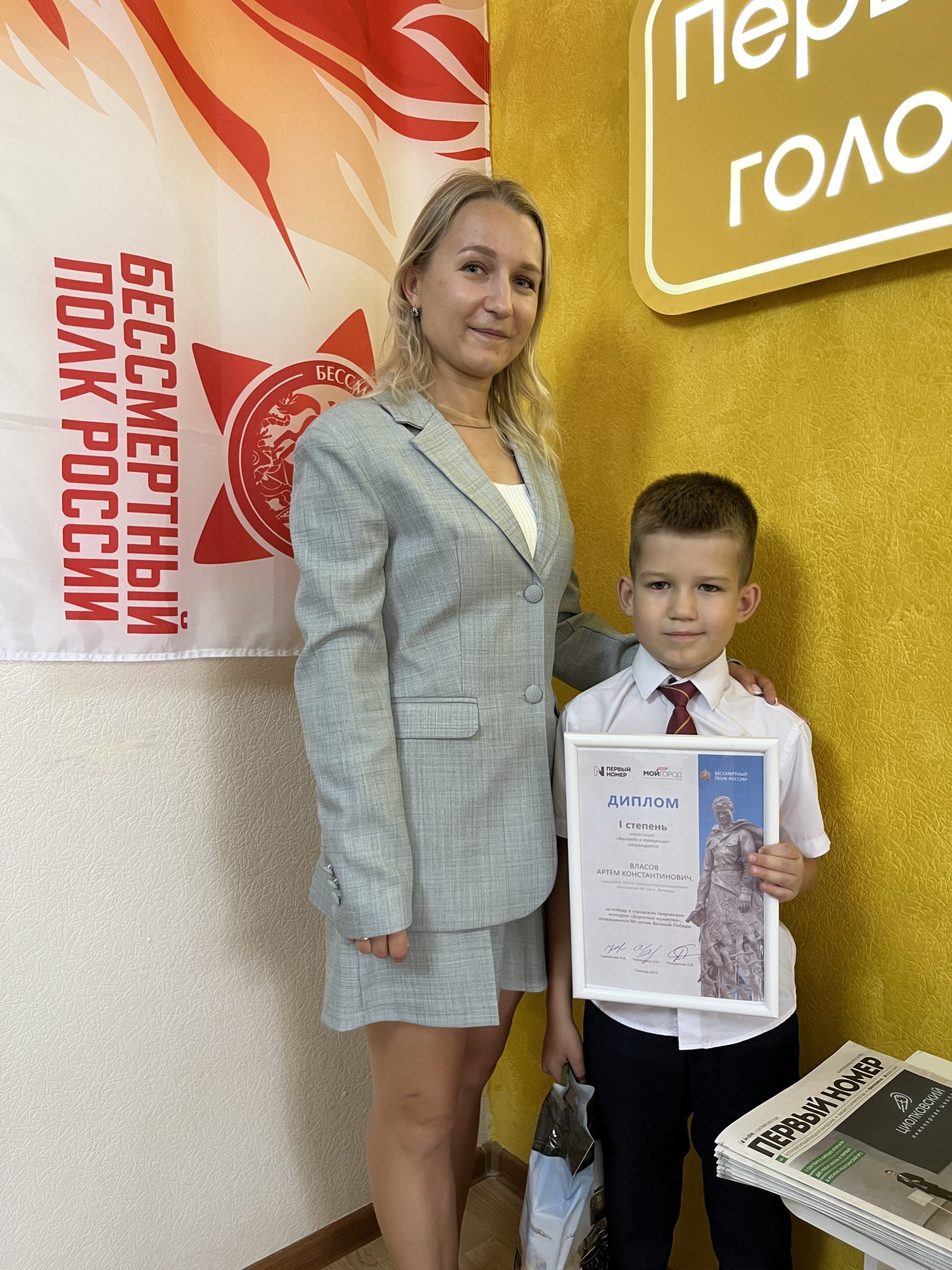 ученик школы № 26 награждена дипломом I степени за стихотворение «Ветеран войны». На награждение он пришёл в редакцию с мамой.