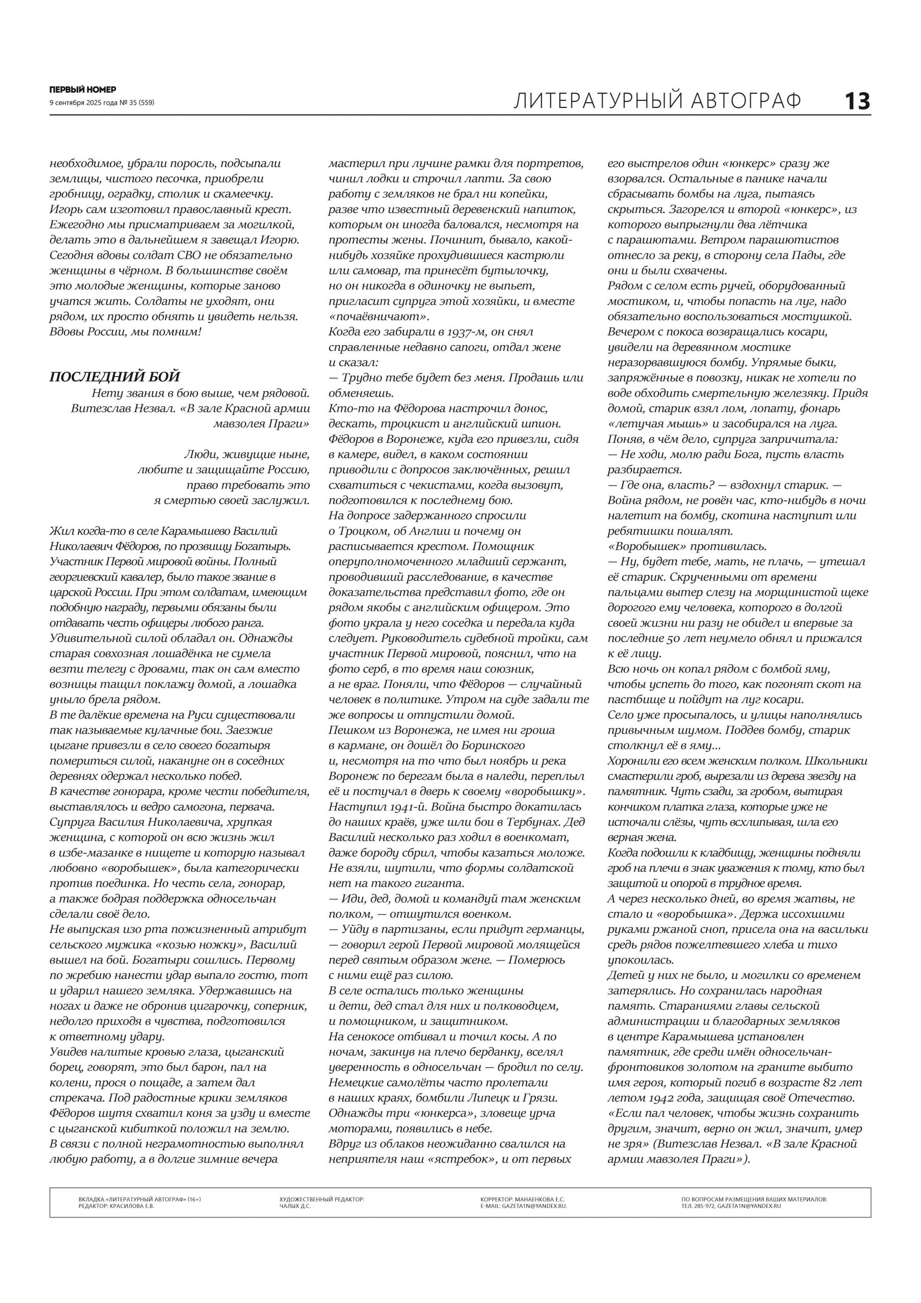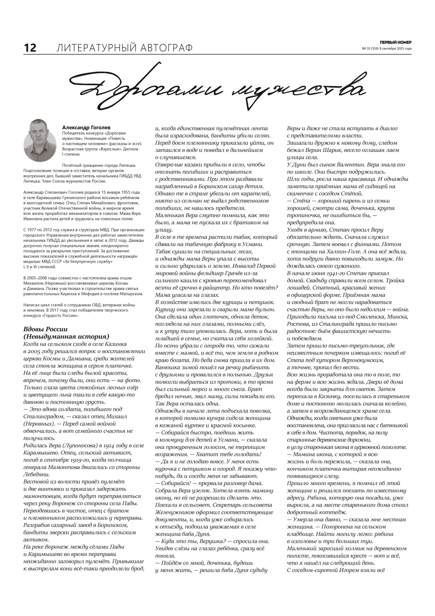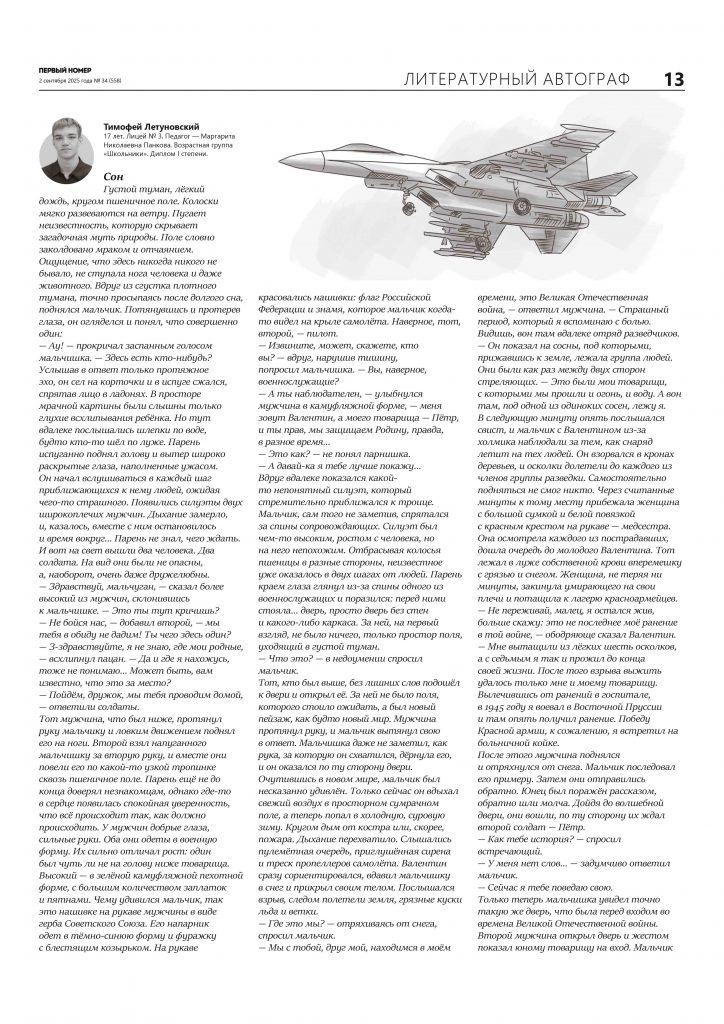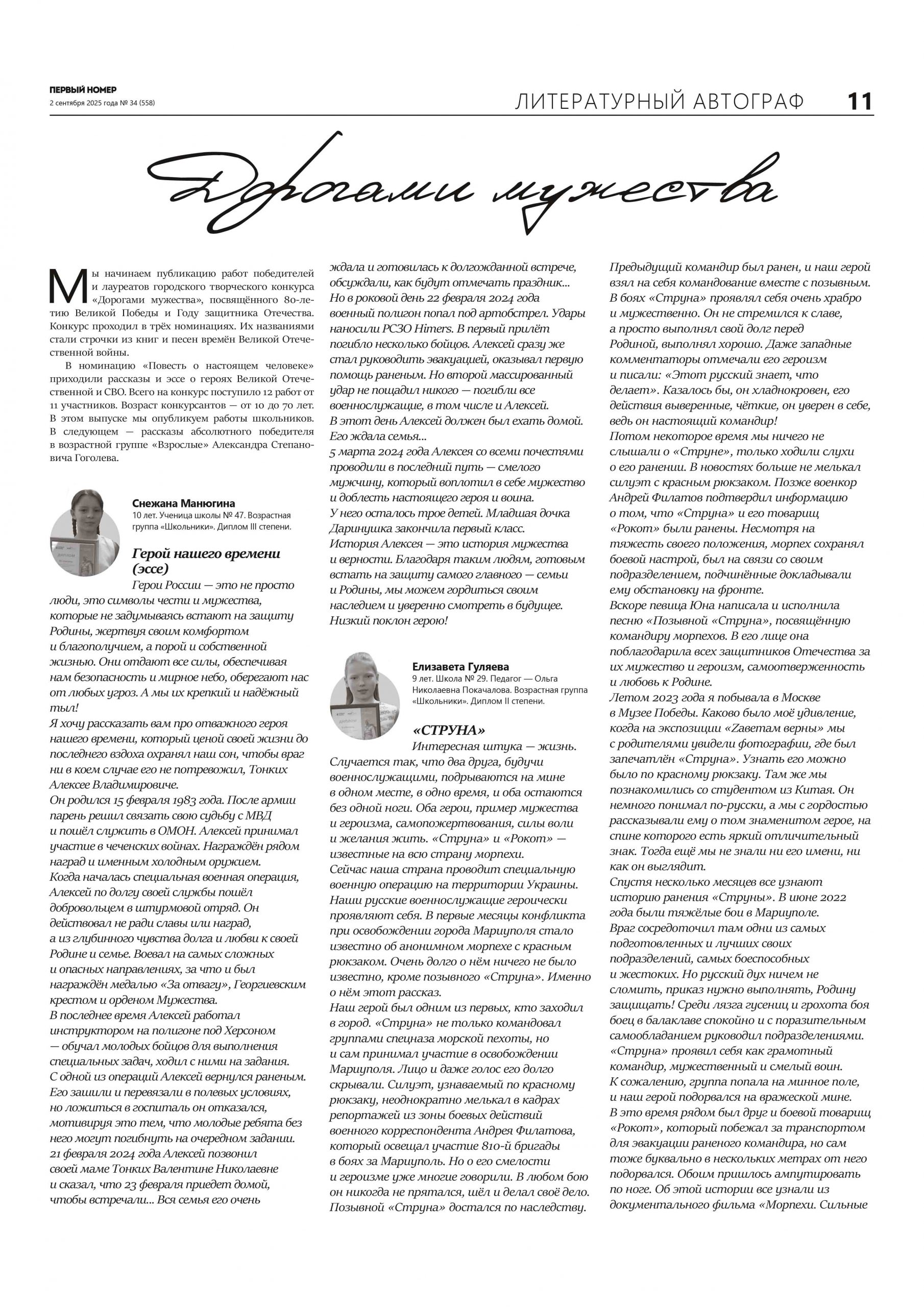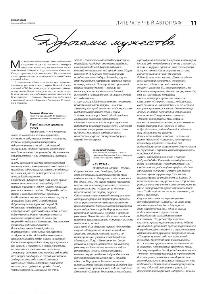 В первом выпуске вышли лучшие произведения из номинации «Повесть о настоящем человеке». Это рассказы и эссе о героях Великой Отечественной и СВО. Всего на конкурс поступило 12 работ от 11 участников. Возраст конкурсантов — от 10 до 70 лет. В первом тематическом выпуске вкладки «Литературный автограф» мы опубликовали работы школьников. Произведения размещены здесь.