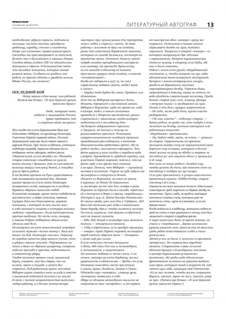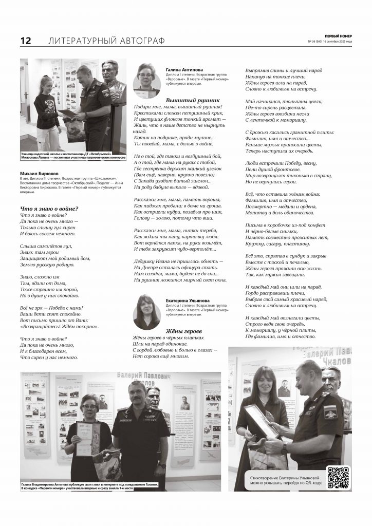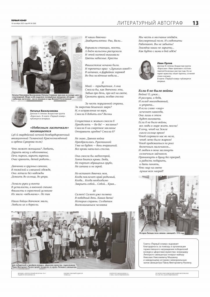 В сегодняшнем выпуске газеты «Первый номер» № 36 от 16 сентября вышла очередная вкладка «Литературный автограф» с работами победителей и лауреатов городского творческого конкурса «Дорогами мужества», посвящённого 80-летию Великой Победы и Году защитника Отечества. На 11, 12 и 13 страницах напечатаны пронзительные и трогательные стихотворения, короткие биографии их авторов и фотографии с церемонии награждения победителей и лауреатов конкурса. Интернет-версия вкладки размещена здесь.