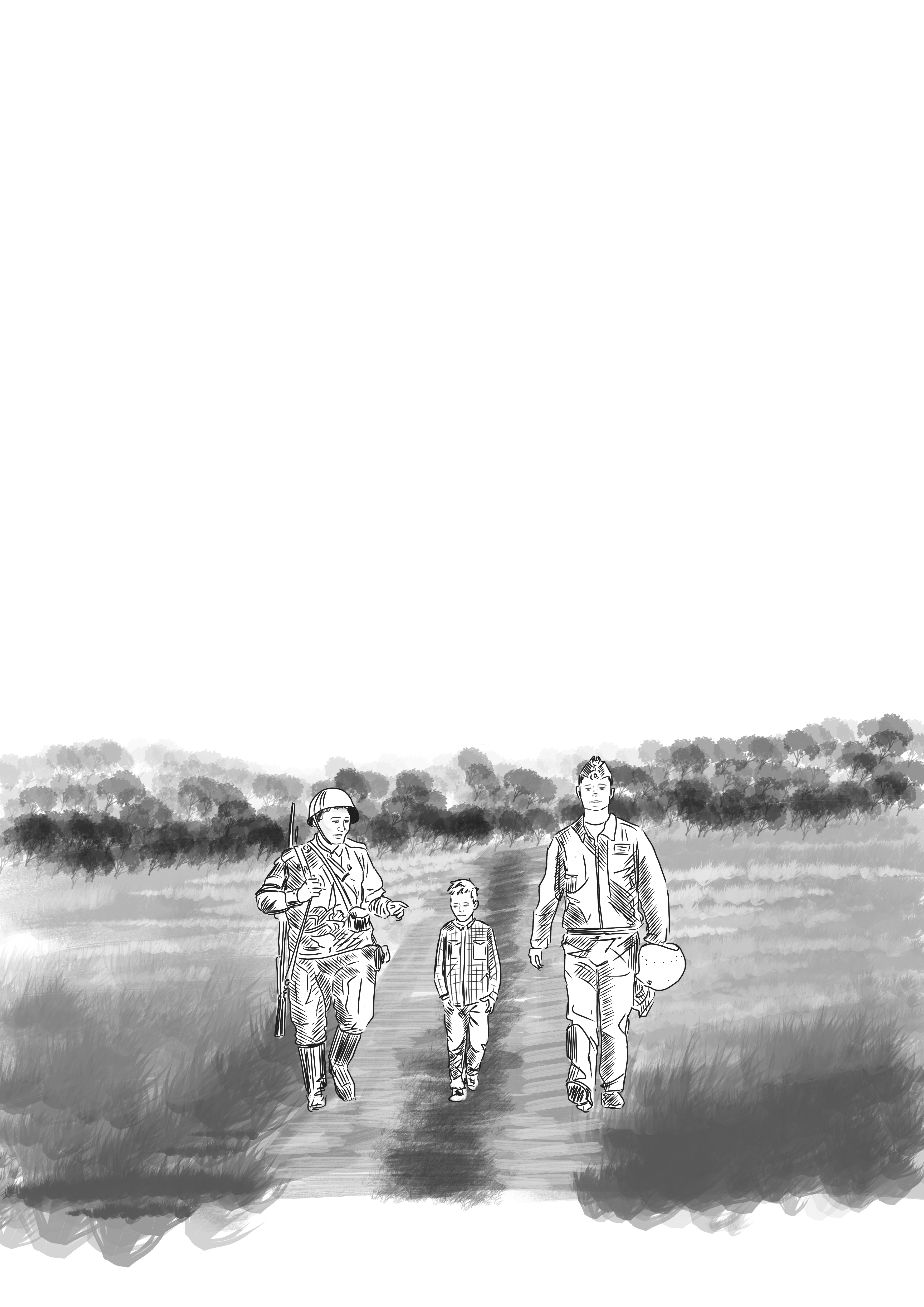 Услышав в ответ только протяжное эхо, он сел на корточки и в испуге сжался, спрятав лицо в ладонях. В просторе мрачной картины были слышны только глухие всхлипывания ребёнка. Но тут вдалеке послышались шлепки по воде, будто кто-то шёл по луже. Парень испуганно поднял голову и вытер широко раскрытые глаза, наполненные ужасом. Он начал вслушиваться в каждый шаг приближающихся к нему людей, ожидая чего-то страшного. Появились силуэты двух широкоплечих мужчин. Дыхание замерло, и, казалось, вместе с ним остановилось и время вокруг… Парень не знал, чего ждать. И вот на свет вышли два человека. Два солдата. На вид они были не опасны, а, наоборот, очень даже дружелюбны.