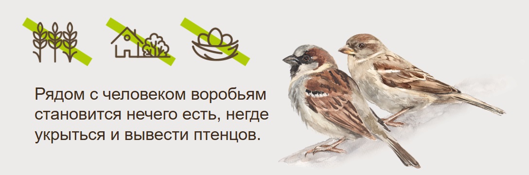 Для воробьёв чердаки в большей степени нужны для гнёзд, а с пропитанием у них попроще. Полевой воробей вообще питается семенами злаковых, сорняков или почками деревьев — как говорят орнитологи, кормами не антропогенного происхождения. Домовый воробей только зимой нуждается в том, чтобы человек его подкармливал, и кормушки развешивают именно для него.