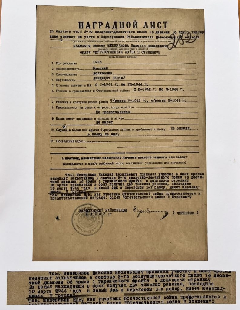 — Когда искала информацию о дедушке, радовалась каждому новому факту, — делится Юля. — Очень помог сайт «Подвиг народа», где хранятся небольшая биографическая справка о Николае Вавиловиче и наградной лист на его имя. Благодаря этим документам мы точно знаем, что дед попал на фронт в октябре 1941 года. Потом участвовал в боях против немецких захватчиков в составе войск 1-го Украинского фронта в должности стрелка.