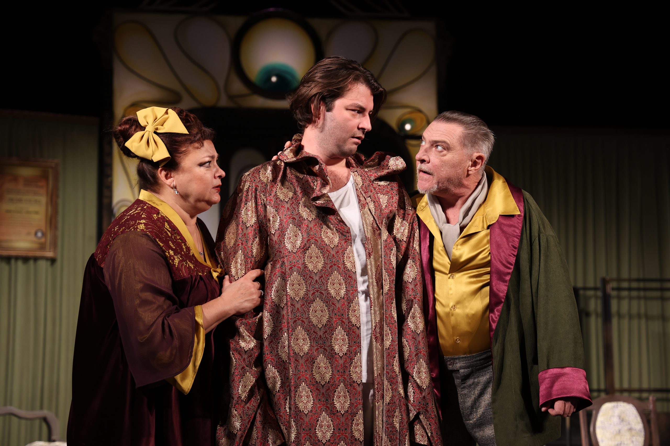 — Я отталкивалась от образа главного героя, от Животы, — он такой павлин сам по себе, — объяснила художник-постановщик спектакля, главный художник Серпуховского драмтеатра Анастасия Данилова-Кухно. — Я очень люблю комедии: тут, как говорится, можно творить на широкую ногу. Ну я и постаралась.