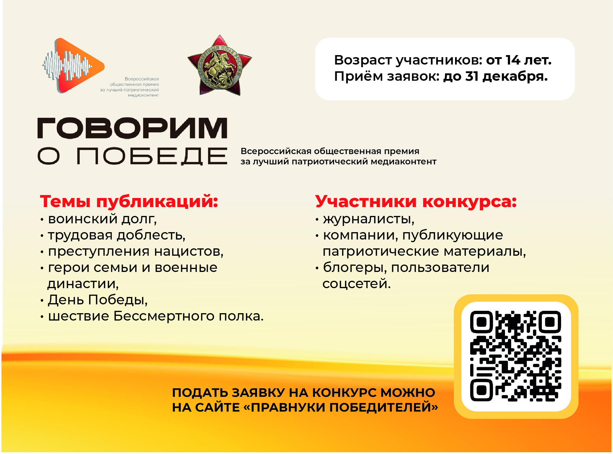 «Бессмертный полк России» запустил конкурс на присуждение Всероссийской общественной премии за лучший патриотический медиаконтент (16+). Приём заявок идёт на сайте конкурса до 31 декабря.