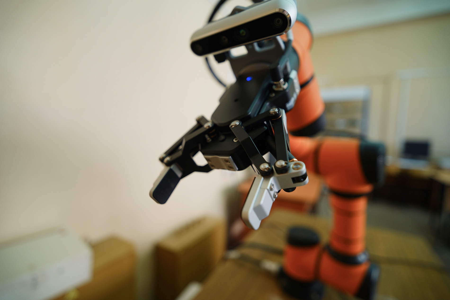 Его передал студентам Новолипецкий металлургический комбинат. В отличие от традиционных промышленных роботов, он может работать над задачей непосредственно вместе с человеком: машина мгновенно реагирует на прикосновение и останавливается при препятствии.