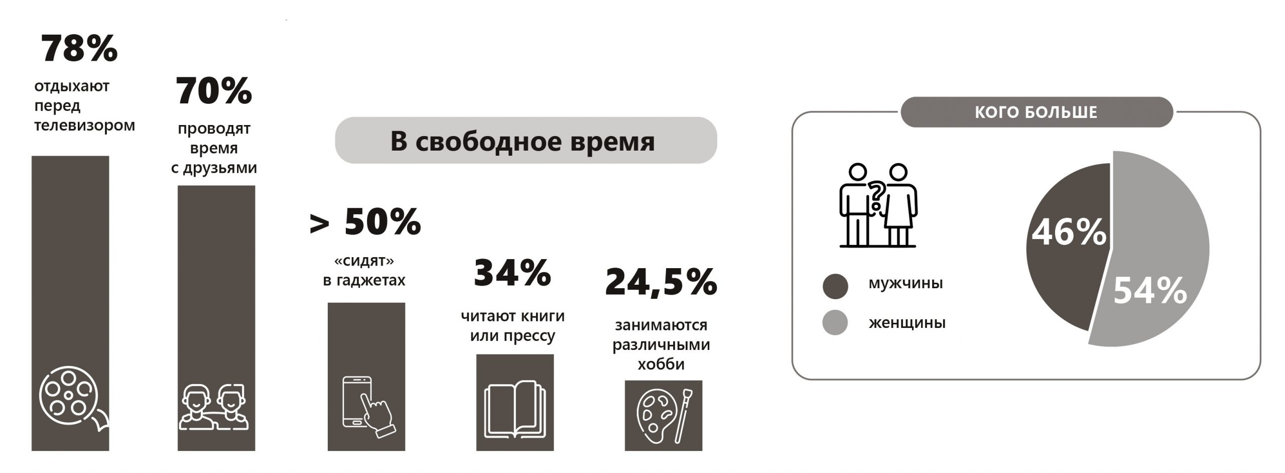а любимый досуг — просмотр фильмов и телепередач. Большинство состоят в официальном браке, и почти у половины семей есть легковой автомобиль. Россияне предпочитают вести правильный образ жизни и убеждены, что состояние здоровья