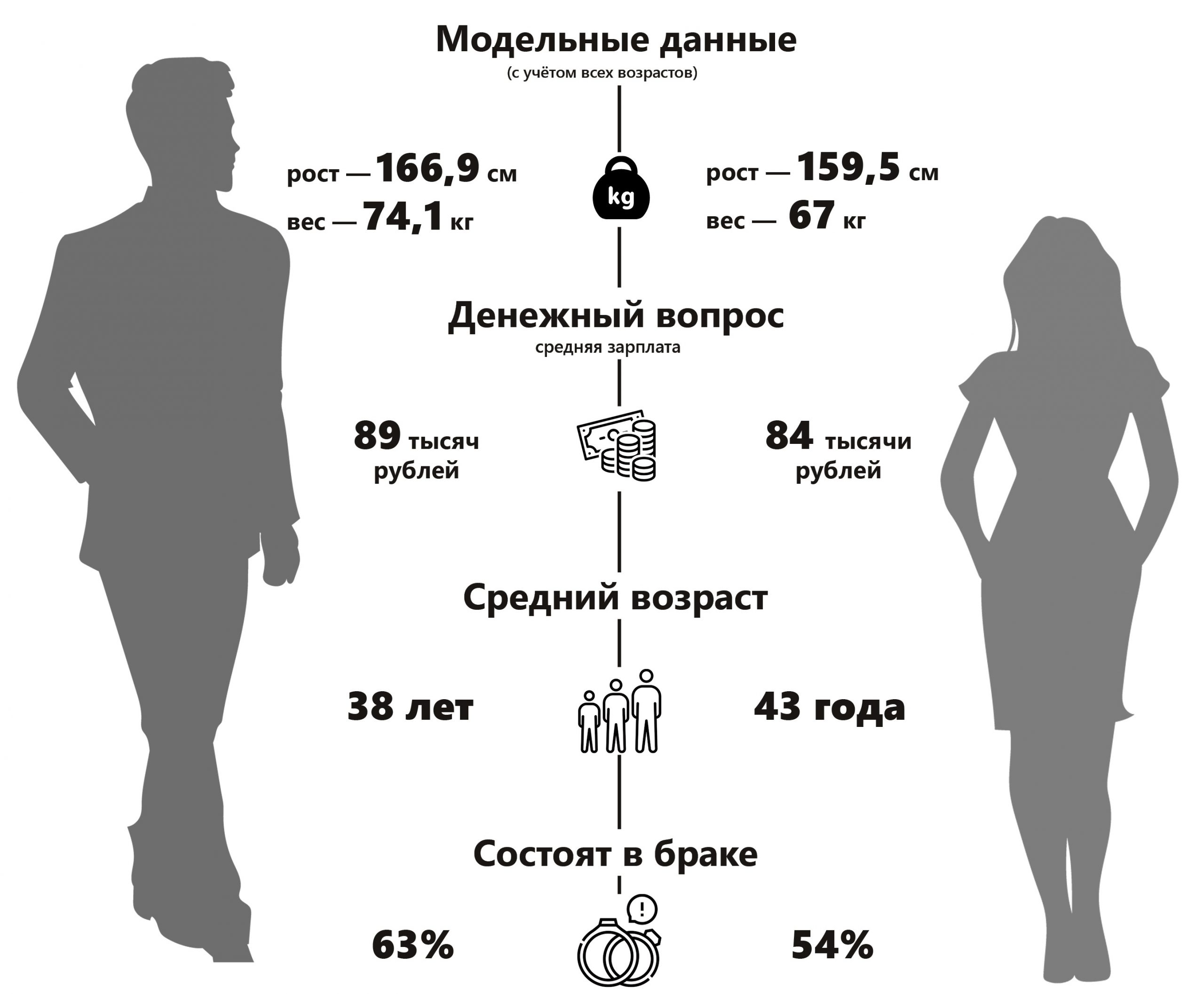 И вот что получилось. Среднестатистический работающий россиянин — это замужняя женщина с высшим образованием, занятая в сфере торговли с зарплатой 84 тысячи рублей до вычета налогов. Средний возраст жителя нашей страны — 41 год,