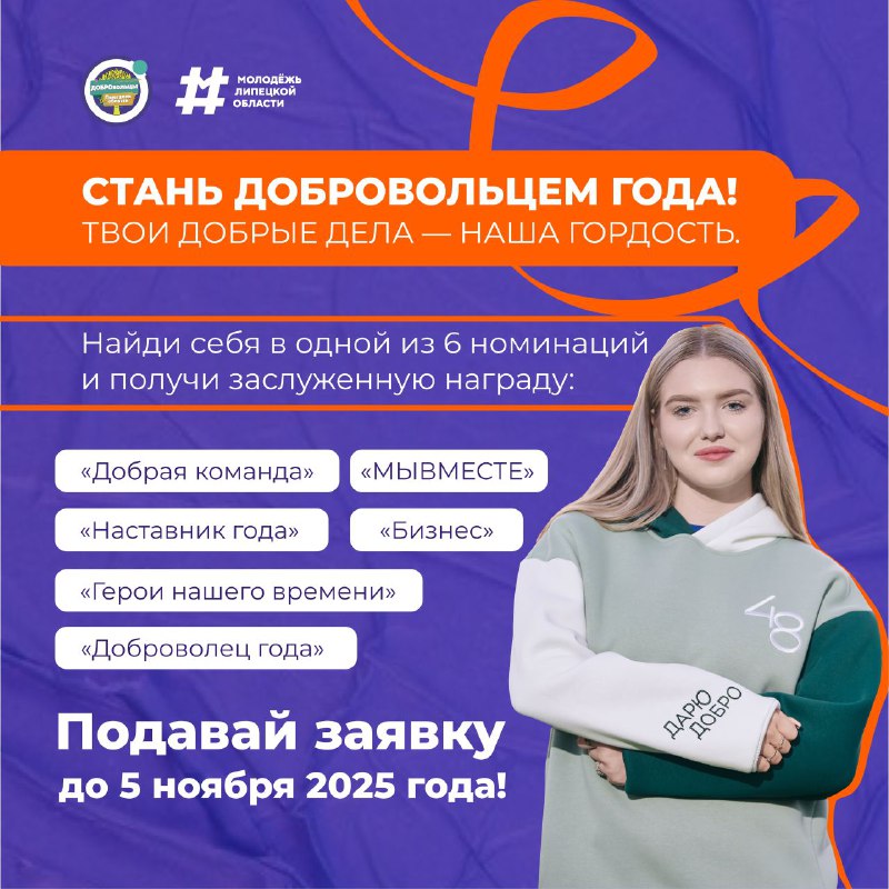 Для участия в конкурсе нужно до 5 ноября 2025 года включительно направить заполненную заявку и конкурсные материалы на электронную почту: dobro_48_omo@mail.ru с пометкой «Доброволец года». Подробные требования и критерии оценки для каждой номинации представлены в Положении о конкурсе.