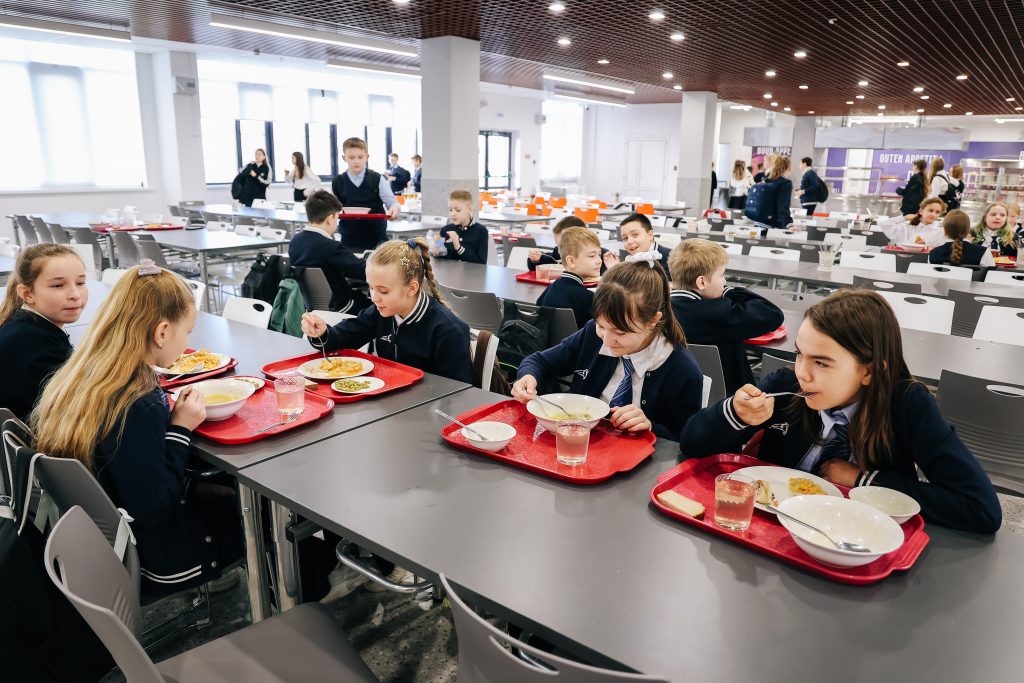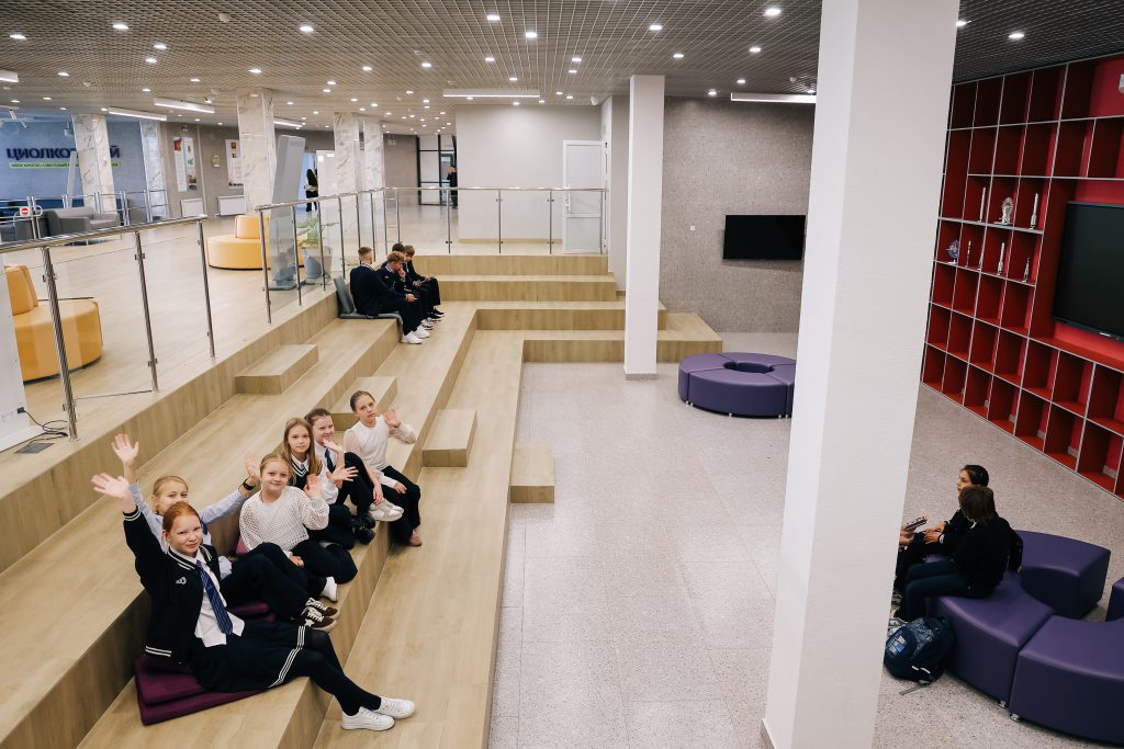 Если театр начинается с вешалки, то «космическая» школа — с амфитеатра… Это пространство на первом этаже с удобными диванами, где детям будут показывать обучающие фильмы или мультики. Для занятий физкультурой в школе оборудованы четыре спортзала и один хореографический класс со станками и зеркалами. Модульная библиотека, где кроме книг появятся ноутбуки, — рабочая зона для подготовки домашнего задания. Есть актовый зал на 600 зрителей, просторная столовая на 800 мест. К слову, готовить космические завтраки школьники могут научиться и самостоятельно.