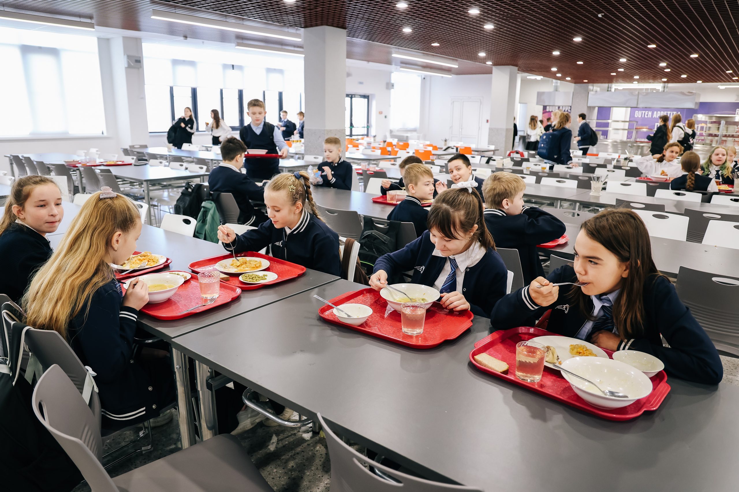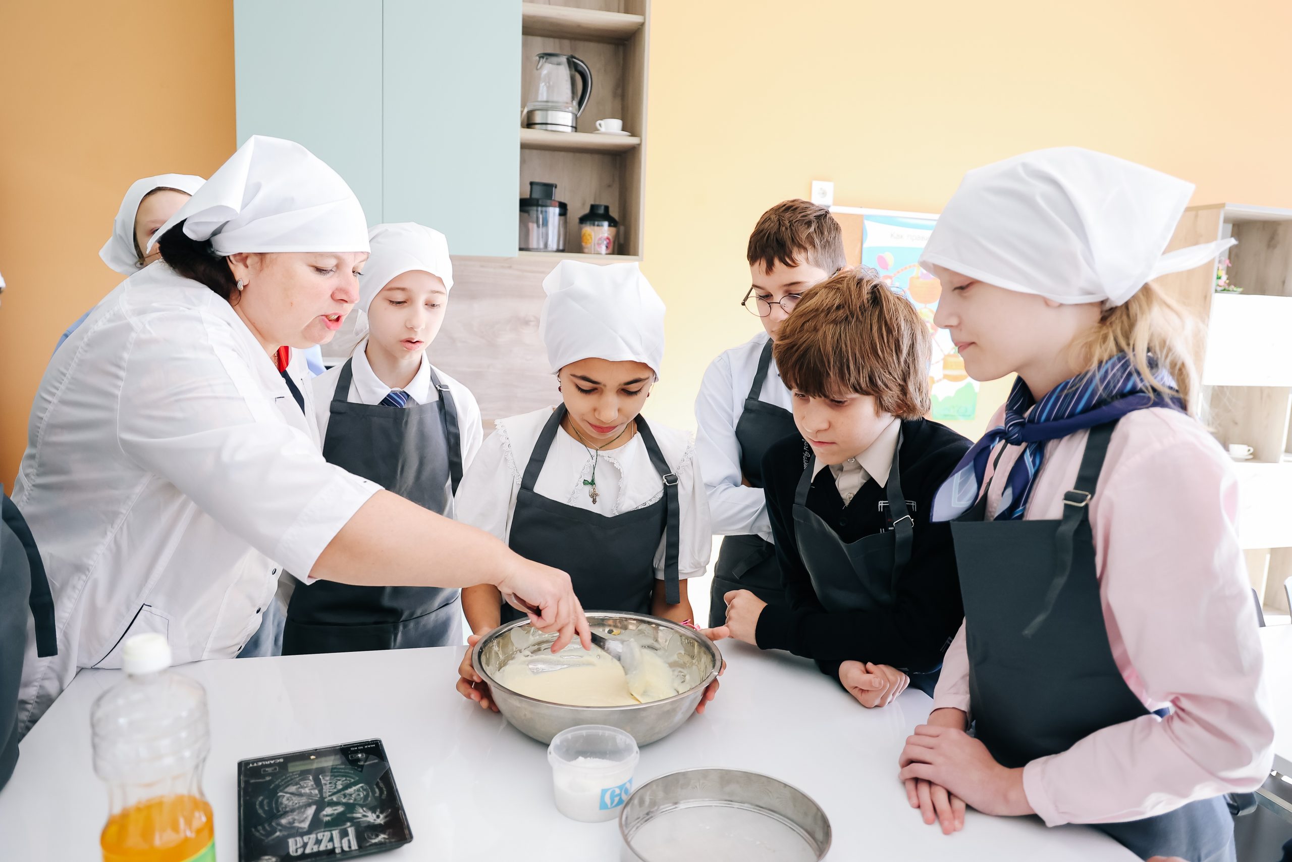 Урок технологии. Модуль «Кулинария». В 5 «гамма» классе педагог объясняет, как испечь оладьи. Альбина Григорян, не стесняясь нашей камеры, деловито месит тесто. Одноклассники тоже участвуют в процессе готовки: щедро подливают кефир, подсыпают сахар и соль. Коллективное творчество сближает — и на уроках, и на переменах.