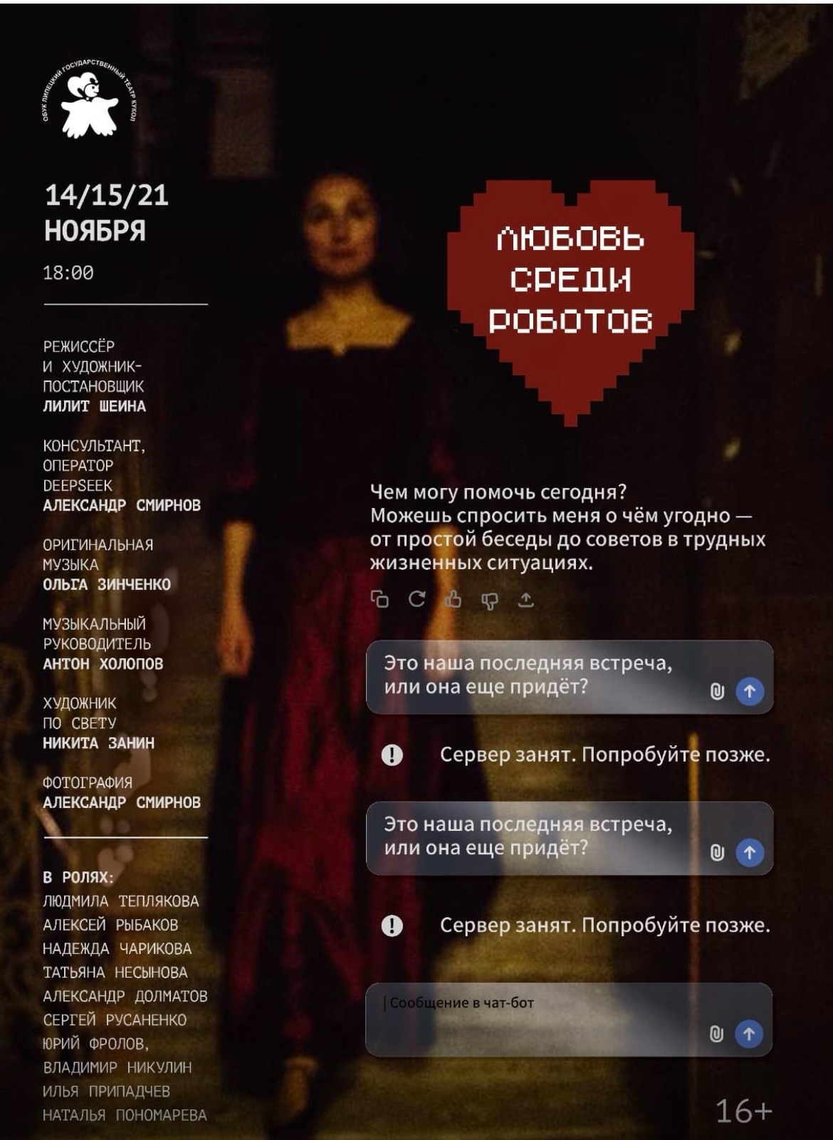 Сценарий спектакля «Любовь среди роботов» 16+ написала Лилит Шеина, не без помощи того же ИИ.