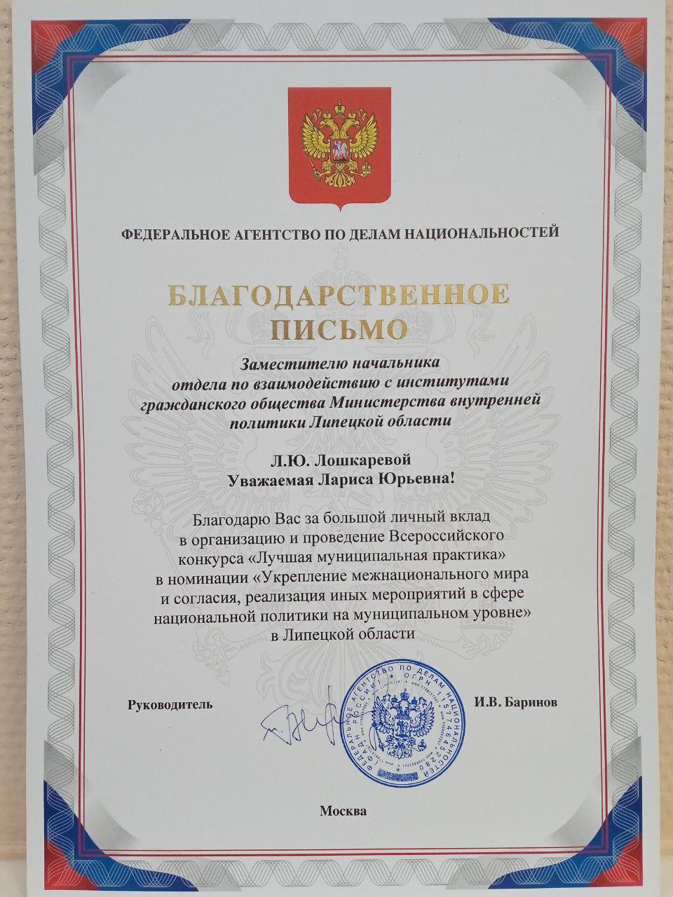 В благодарственном письме, подписанном руководителем ФАДН Игорем Бариновым, особо отмечен личный вклад заместителя начальника отдела Министерства внутренней политики Липецкой области Ларисы Лошкаревой. «Ваша профессиональная работа и ответственный подход к организации конкурса способствовали выявлению лучших муниципальных практик, направленных на укрепление межнационального согласия», — говорится в документе.