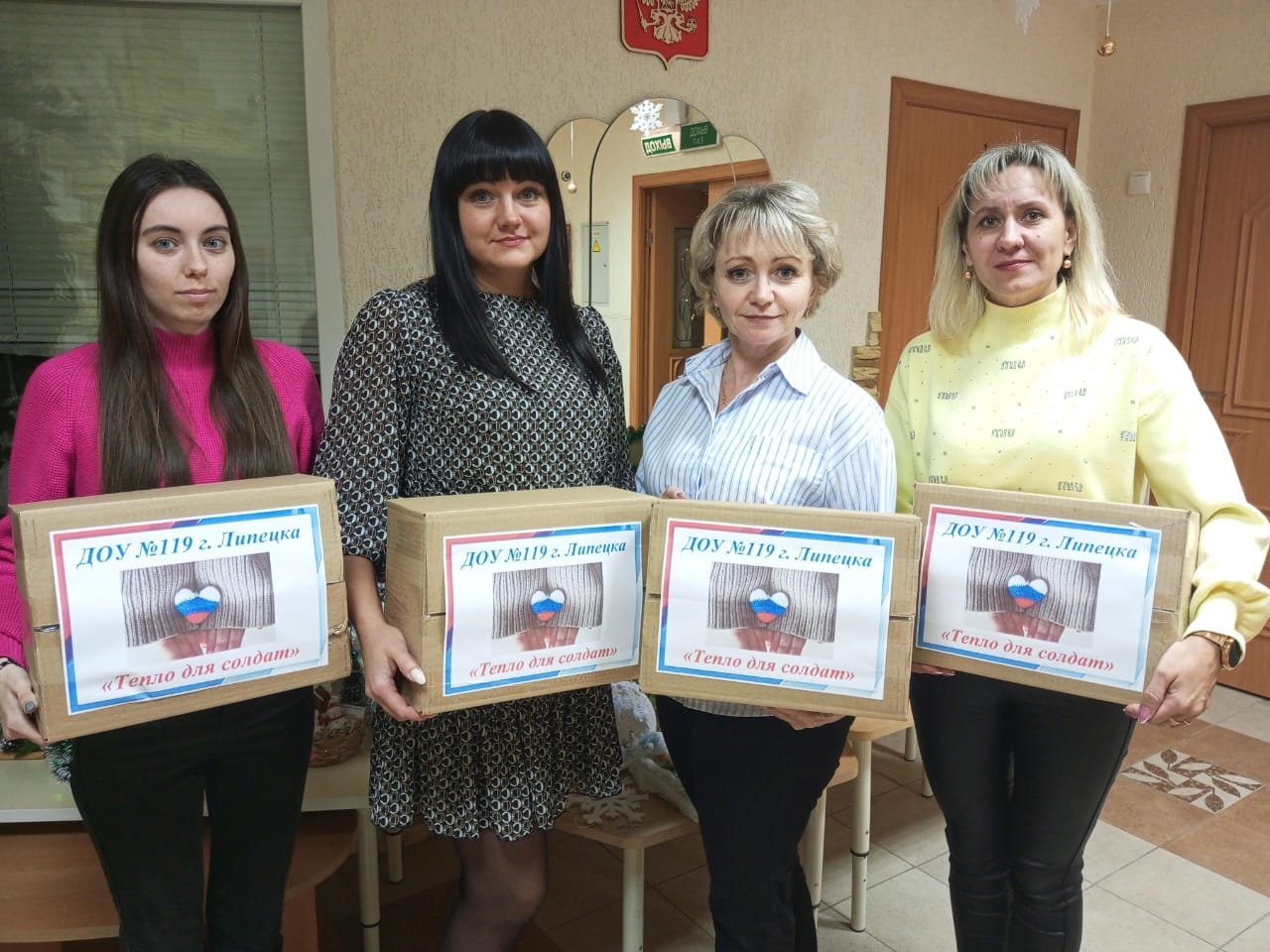 До этого детский сад № 119 принял участие в благотворительной акции «Дай лапу, друг»: дети, родители и педагоги собрали несколько коробок корма для животных приюта «Территория спасения». И тогда они пообещали, что обязательно поучаствуют в акции «Тепло для солдат». Своё слово сдержали.