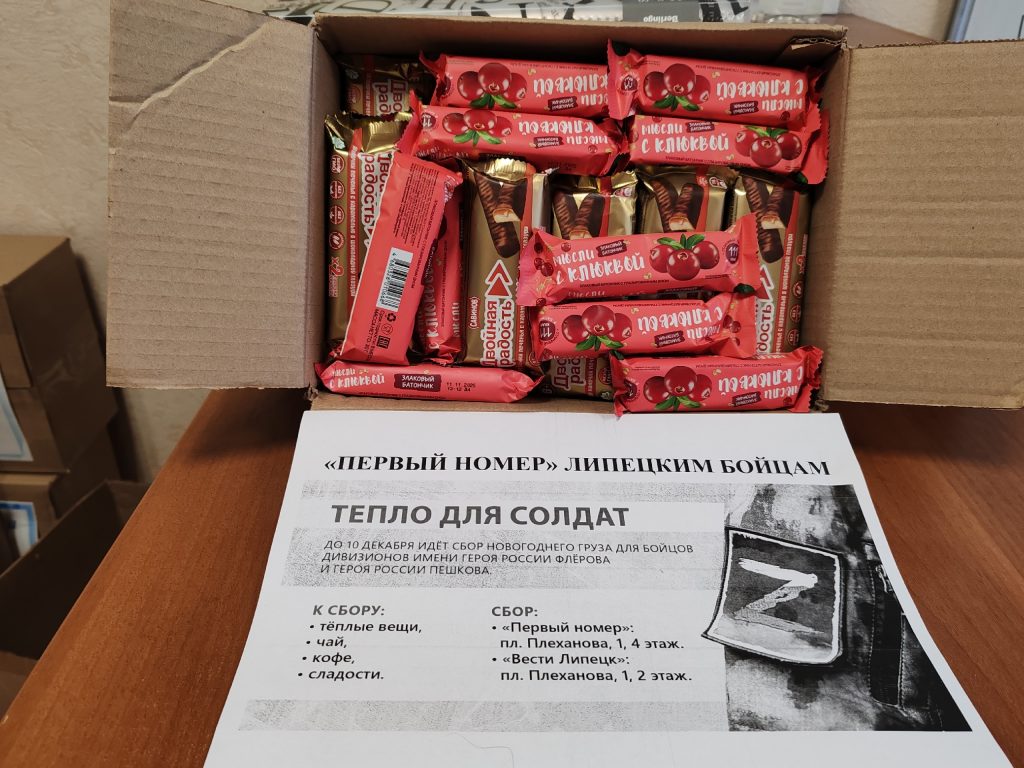 Редакция «Первого номера» решила отправить сладкую и питательную посылку для бойцов липецких артдивизионов имени Ивана Флёрова и Олега Пешкова — 40 шоколадных и злаковых батончиков. Мы не просто собрали деньги, чтобы купить вкусный перекус. Мы ещё сдали макулатуру, чтобы пополнить нашу фронтовую копилку. Ежемесячно журналисты «ПН» откладывают деньги, чтобы покупать для бойцов необходимые вещи или делать им приятные подарки.