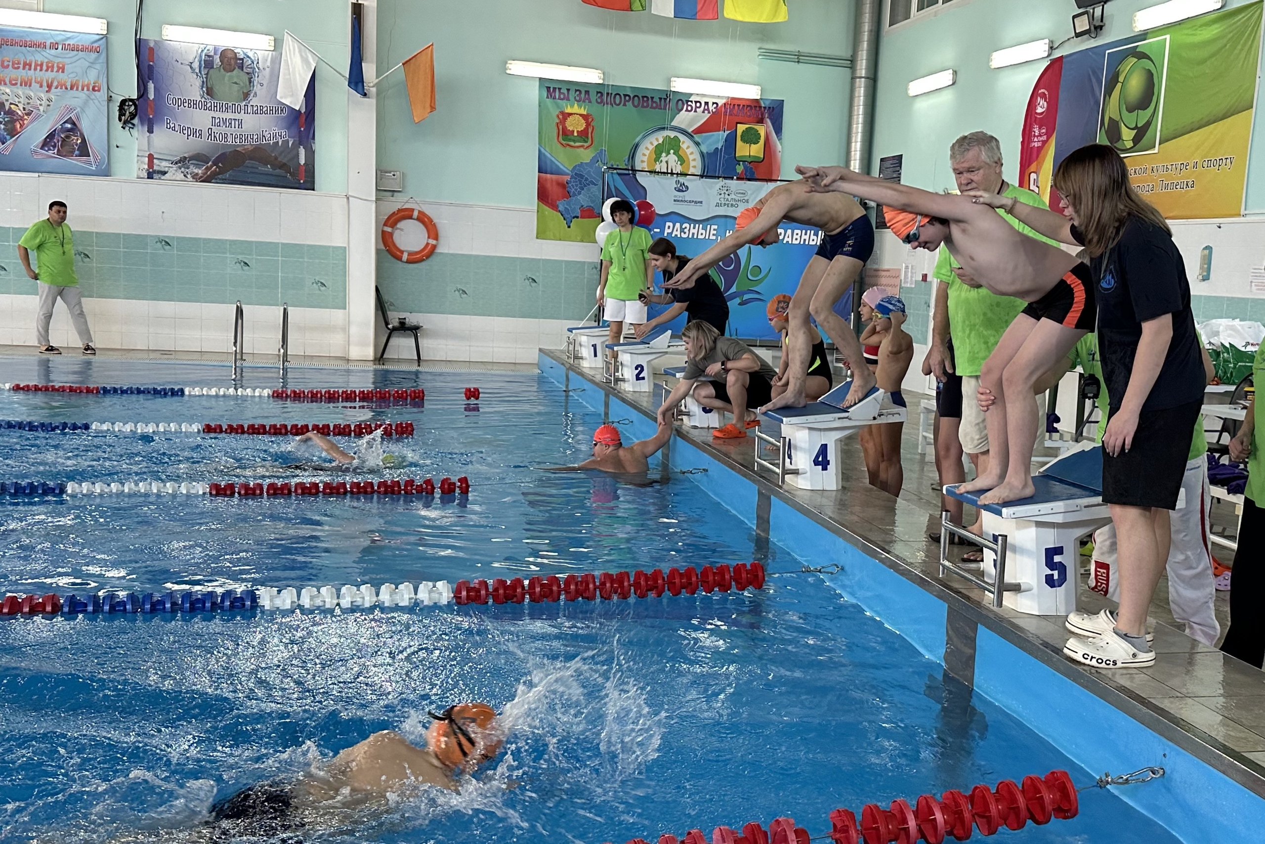 Инклюзивный заплыв провели в Липецке при поддержке фонда «Милосердие». Командная инклюзивная эстафета 4х25 метров, где один из участников каждой команды — особенный ребёнок, прошла в бассейне «Лидер».