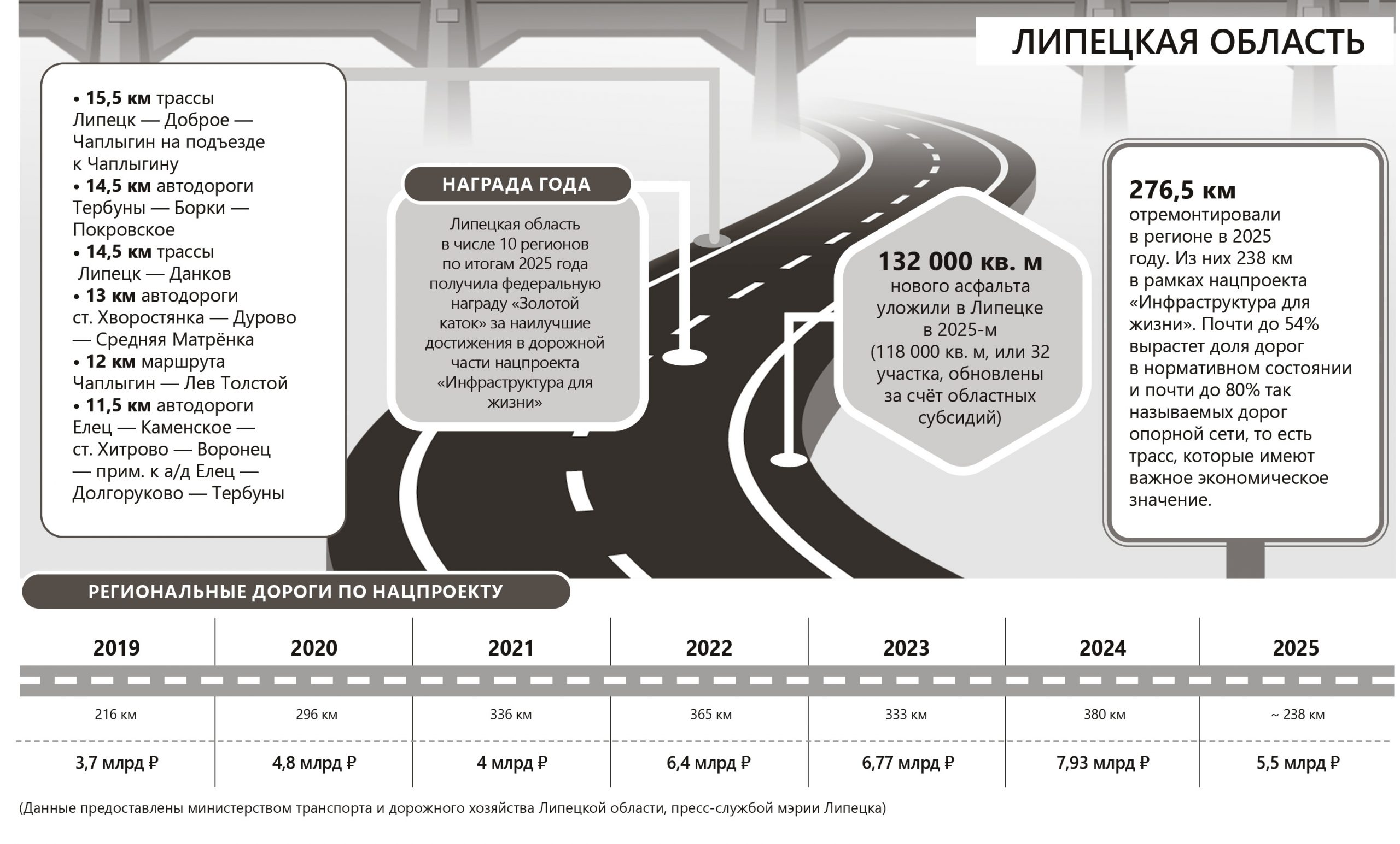 В этом году на дороги Липецка по нацпроекту выделили 1,6 млрд рублей. На дороги региона — 5,5 млрд, в том числе 2,54 млрд из федерального бюджета.