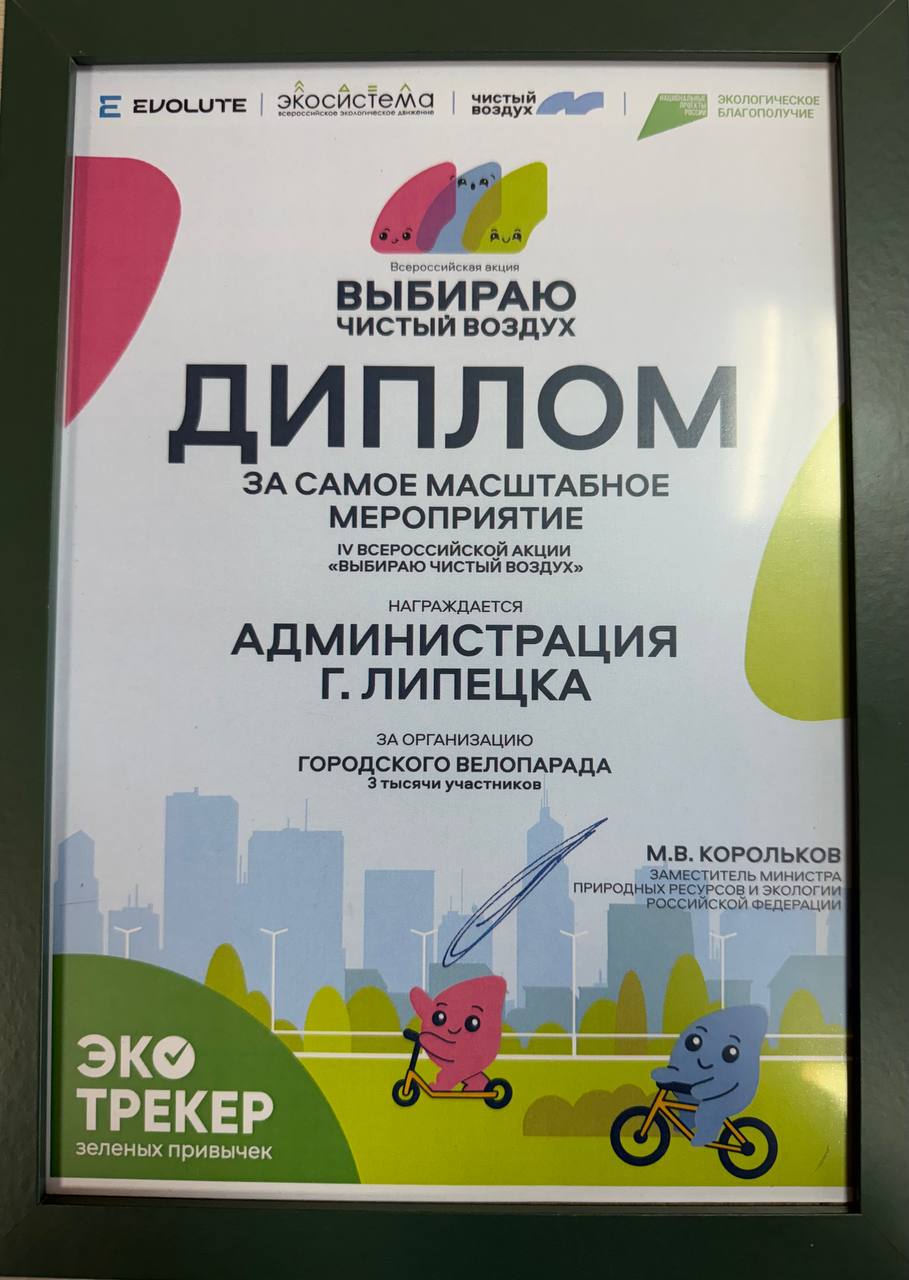 В рамках четвёртой Всероссийской акции «Выбираю чистый воздух» администрация Липецка награждена дипломом.