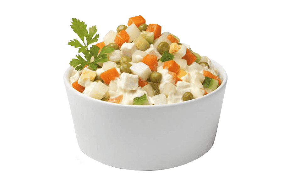 Салат оливье — один из традиционных на праздничном новогоднем столе. Впервые о нём заговорили в 1860-е годы, когда французский шефповар Люсьен Оливье, работавший в Москве, представил это блюдо в своём ресторане «Эрмитаж». Изначально салат оливье включал изысканные ингредиенты: рябчиков, раковые шейки, чёрную икру и каперсы. Но со временем рецепт претерпел значительные изменения, и современная версия состоит из более доступных компонентов: варёного картофеля, моркови, зелёного горошка, солёных и свежих огурцов, яиц и варёной колбасы или курицы. Всё это нарезается мелкими кубиками и заправляется майонезом.