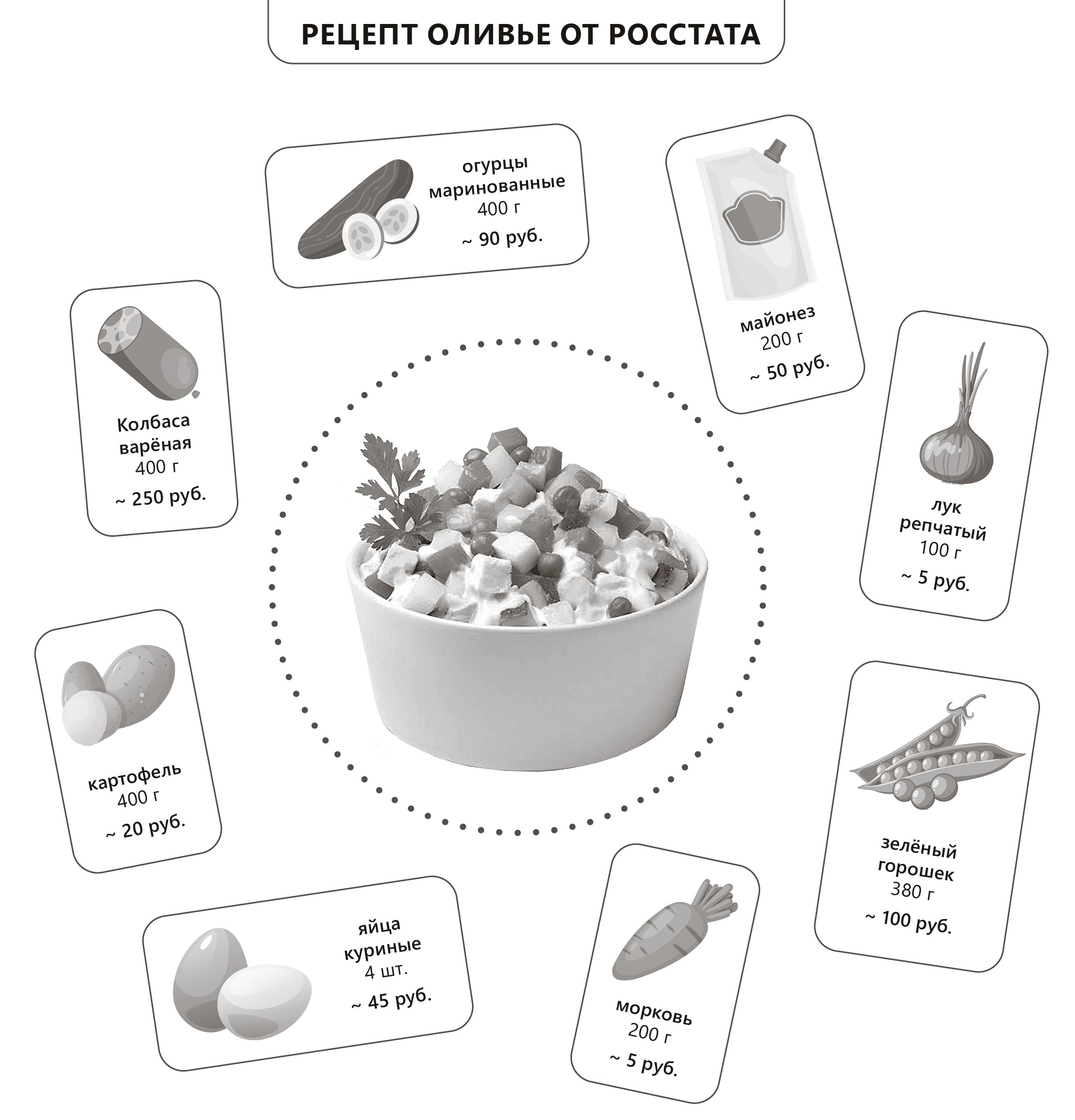 В основе вкусных математических вычислений лежит классический рецепт оливье. Правда, Росстат не стал мелочиться и предлагает готовить на семью из четырёх человек сразу «тазик» салата — около 2,2 кг. Ну, это чтобы было что доедать утром или на тот случай, если нагрянули гости.