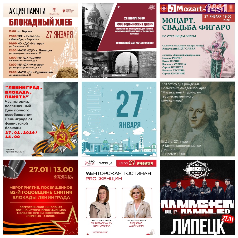 🔸16:00 — «Музыкальный турнир по творчеству великого композитора», посвященный Вольфгангу Амадею Моцарту 6+. Вход свободный. Организатор — Липецкая областная научная библиотека.