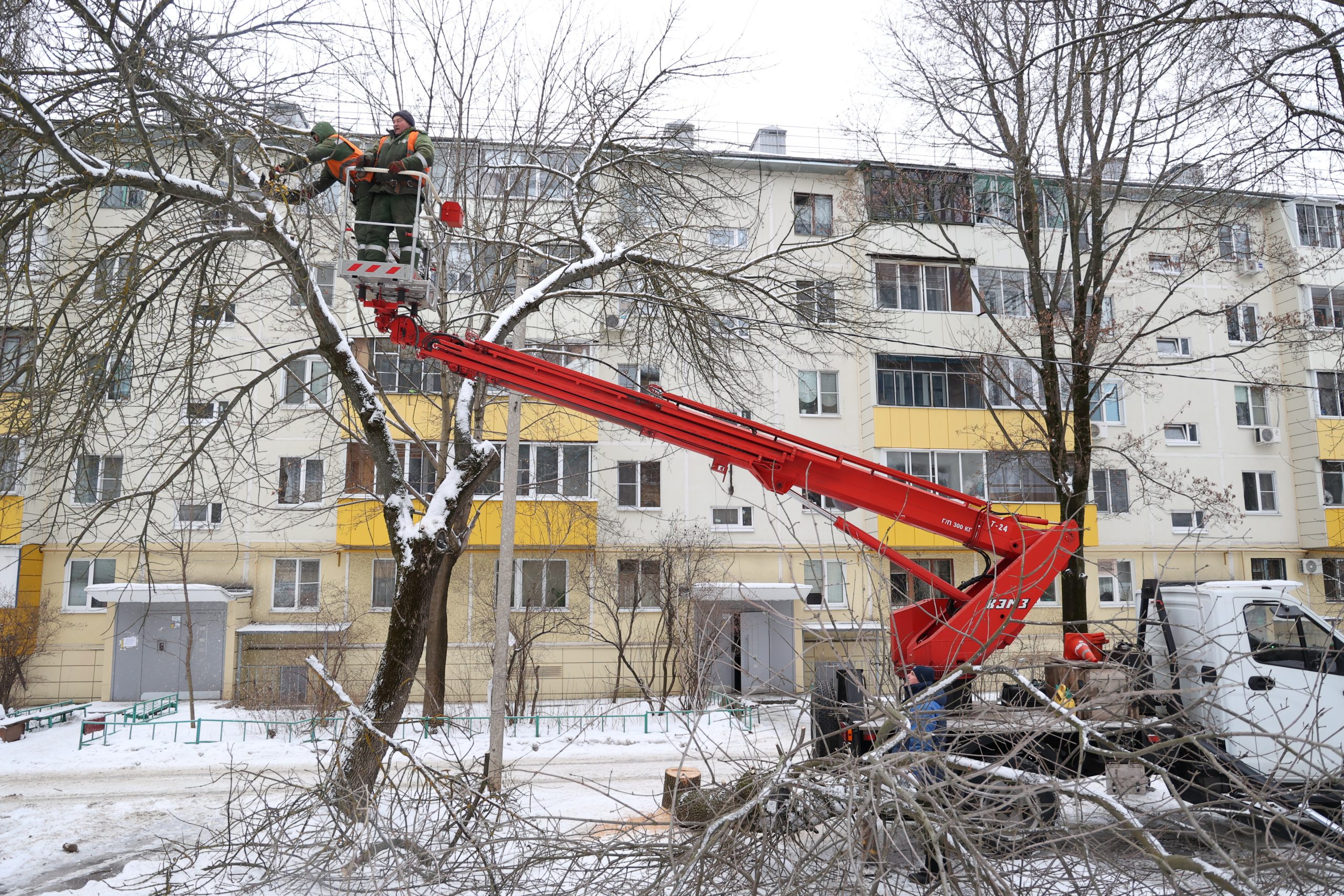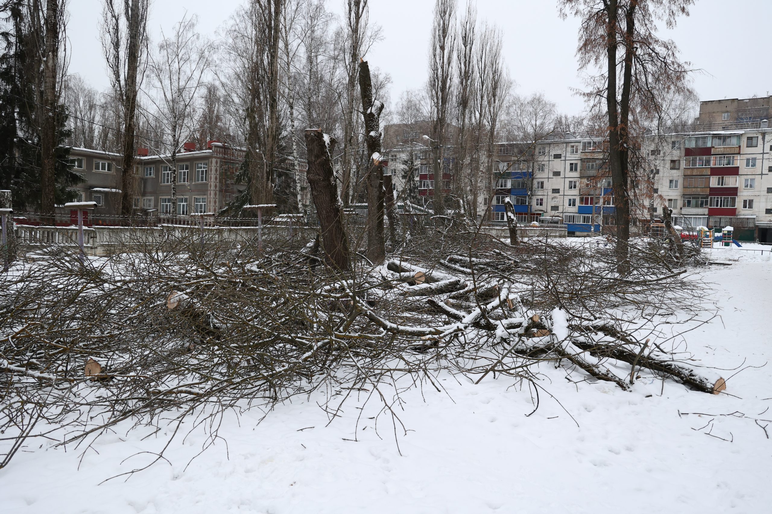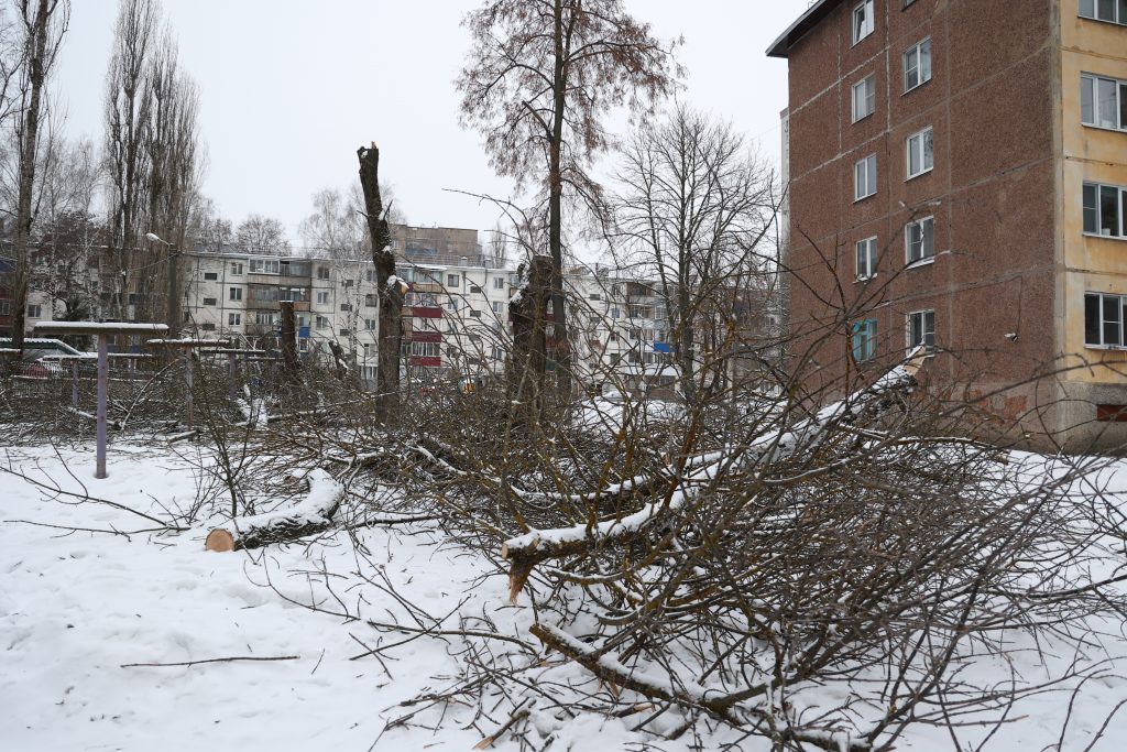Три часа дня. В тихом спальном микрорайоне шумно. Вовсю работает бензопила. Который день работники МУП «Зеленхоз» расчищают дворовые территории.