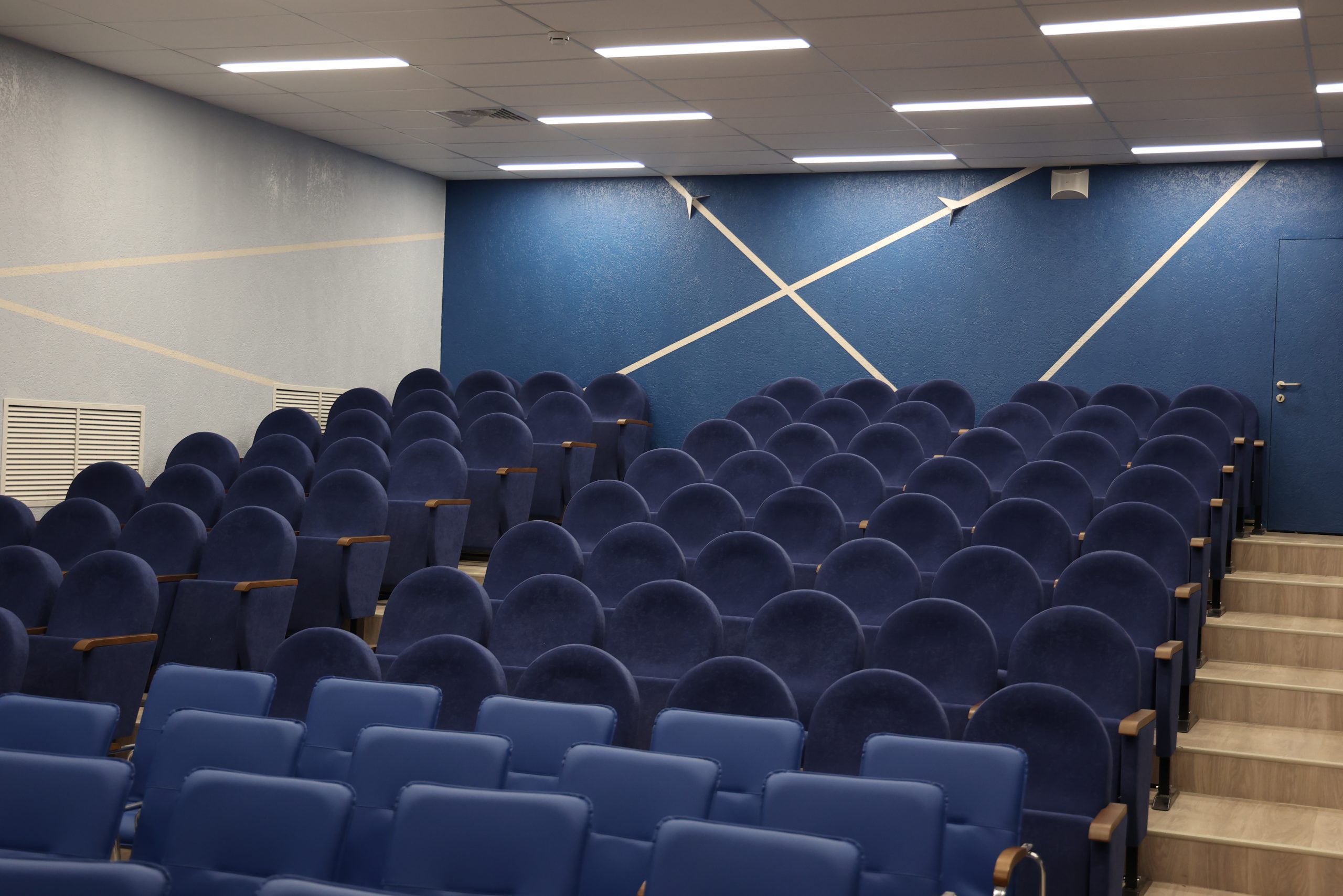 Мы стоим в новом актовом зале, рассчитанном на 200 мест и оборудованном серьёзной световой аппаратурой. И кресла здесь матовые, мягкие, утопающие в окружающую синь.