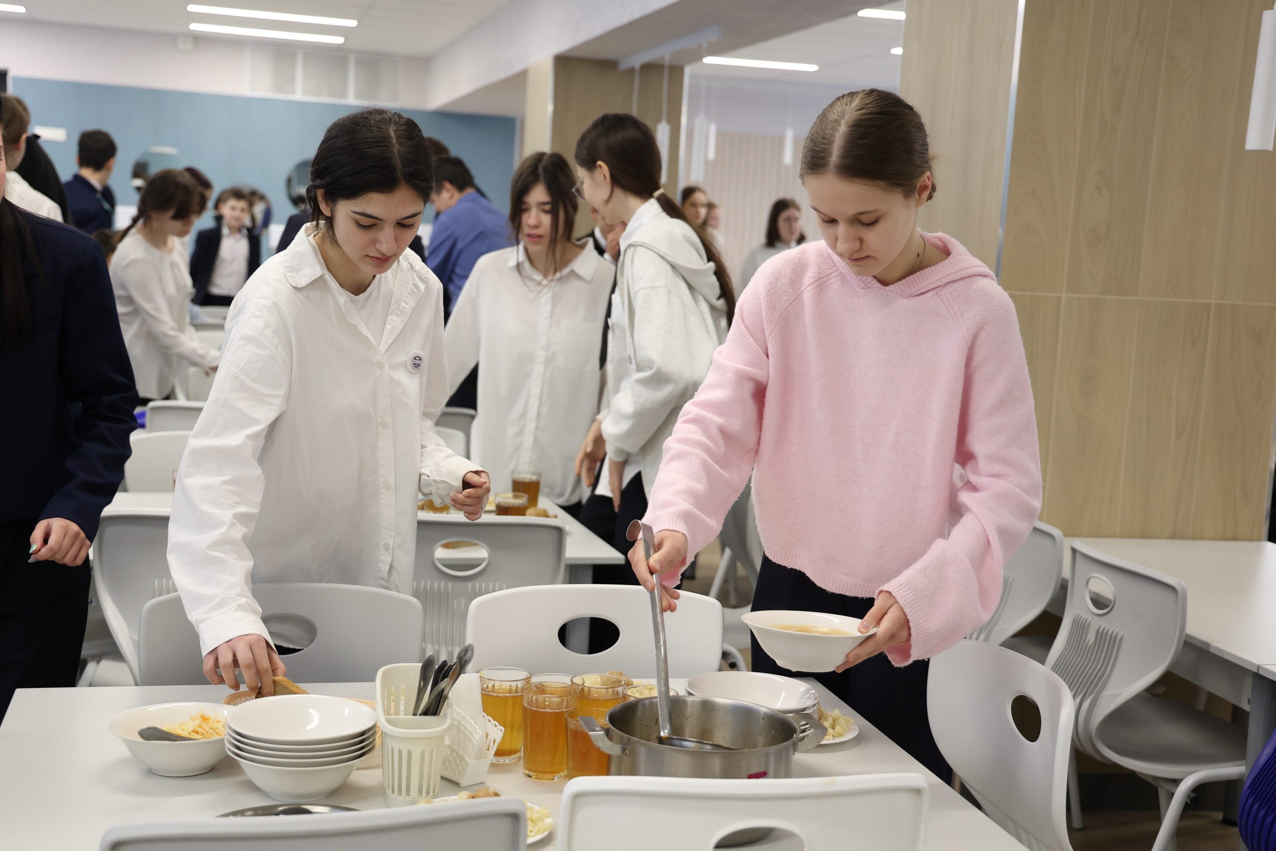 — Голубой, светло-серый, бежевый тона стен как бы расширяют пространство, — говорит одна из девочек.