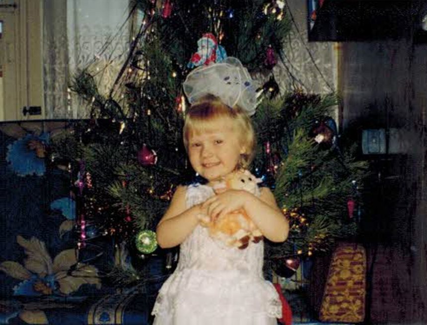 — Когда я была маленькой, мой папа работал в управлении МЧС. И перед Новым годом для детей сотрудников проводили утренники. Вот на фотографии я сижу за папиным столом на работе. Это уже после новогодней ёлки, где мне подарили большой мешок конфет. Но больше я была рада зелёному мишке и шоколадке и тому, что сижу за папиным столом. Тогда всё казалось таким большим и интересным. А ещё помню, когда мне было три годика. Это 1 января 2003 года. Утро, я проснулась, мама меня нарядила, и я сразу побежала смотреть, что там под ёлкой. Папа спрятал под мишурой игрушку. Я еле нашла. Была очень удивлена, что это овечка, а она такая милая оказалась, что я её сразу полюбила.