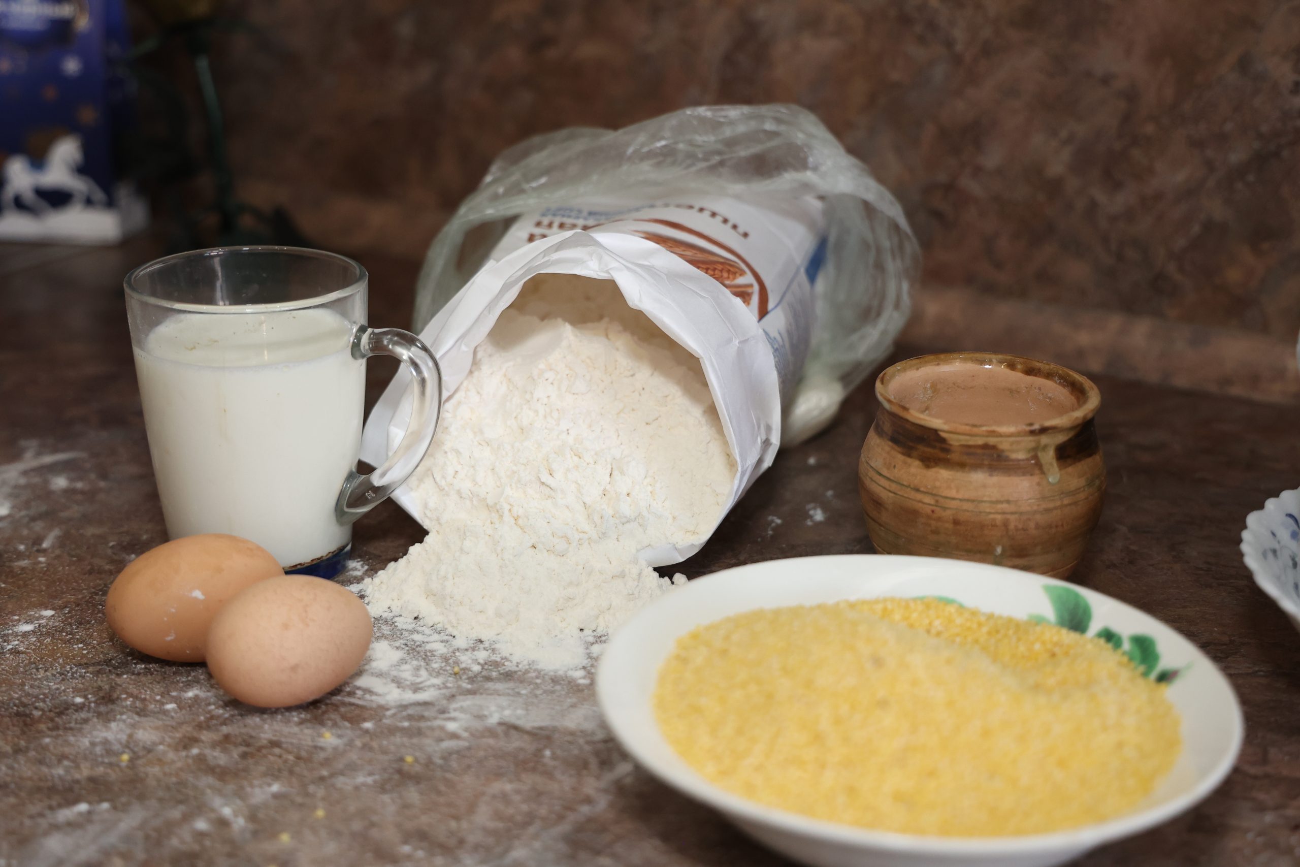 Сварить пшённую кашу из расчёта один стакан, добавить два стакана холодного молока, пару яиц. Через сито просеять в массу муку так, чтобы тесто получилось как жидкая сметана. Приправить двумя пригоршнями сахара и щепоткой соли. Сдобрить массу пакетиком сухих дрожжей. Оставить в тепле на полчасика.