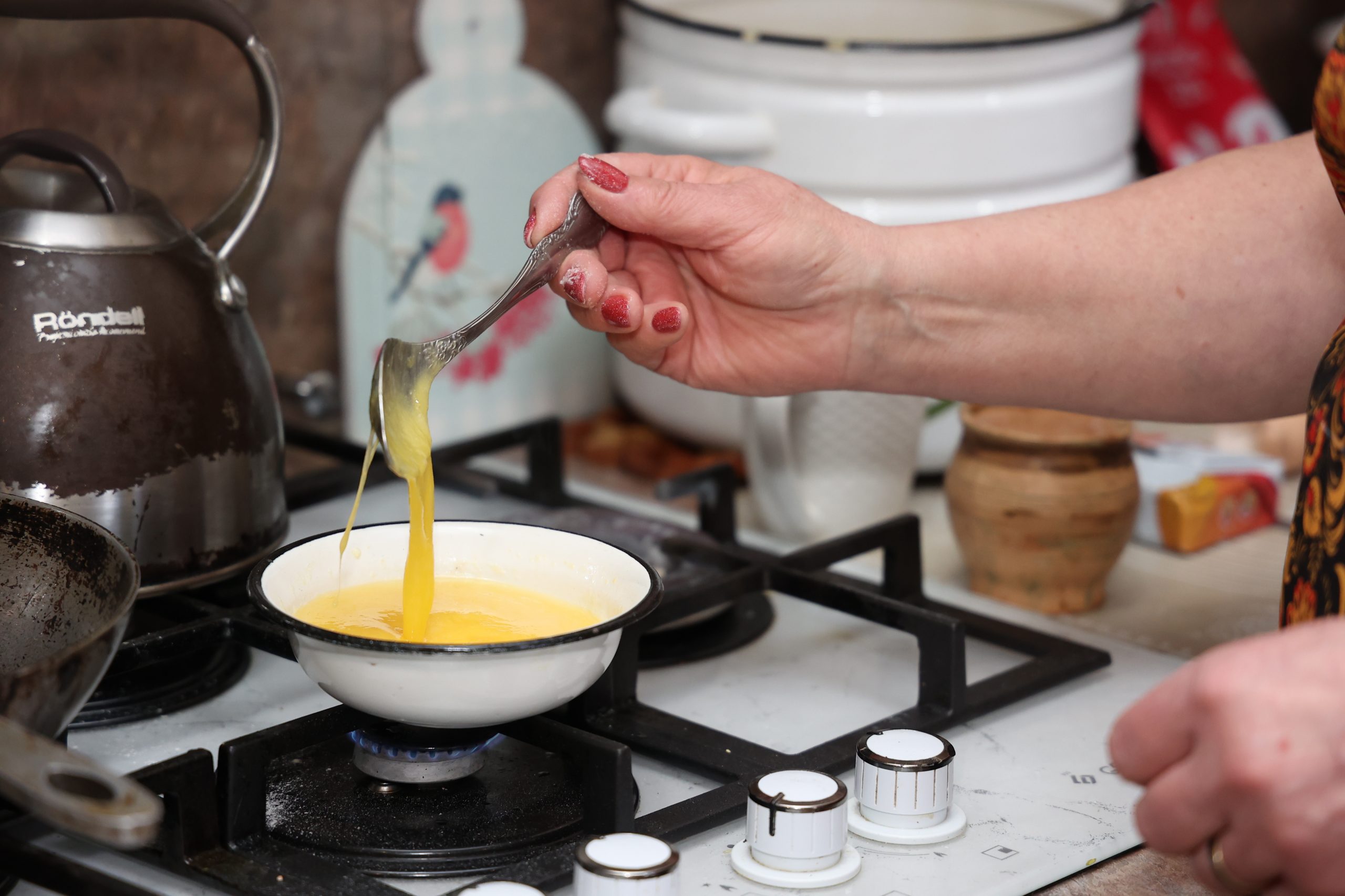 — Берём сливочное масло, нагреваем на огне и в горячее выливаем яйцо, быстро размешивая, чтобы белок не кусками схватился, а превратился в единую с маслом полугустую массу. К блинам — идеальная добавка, — советует хозяйка.