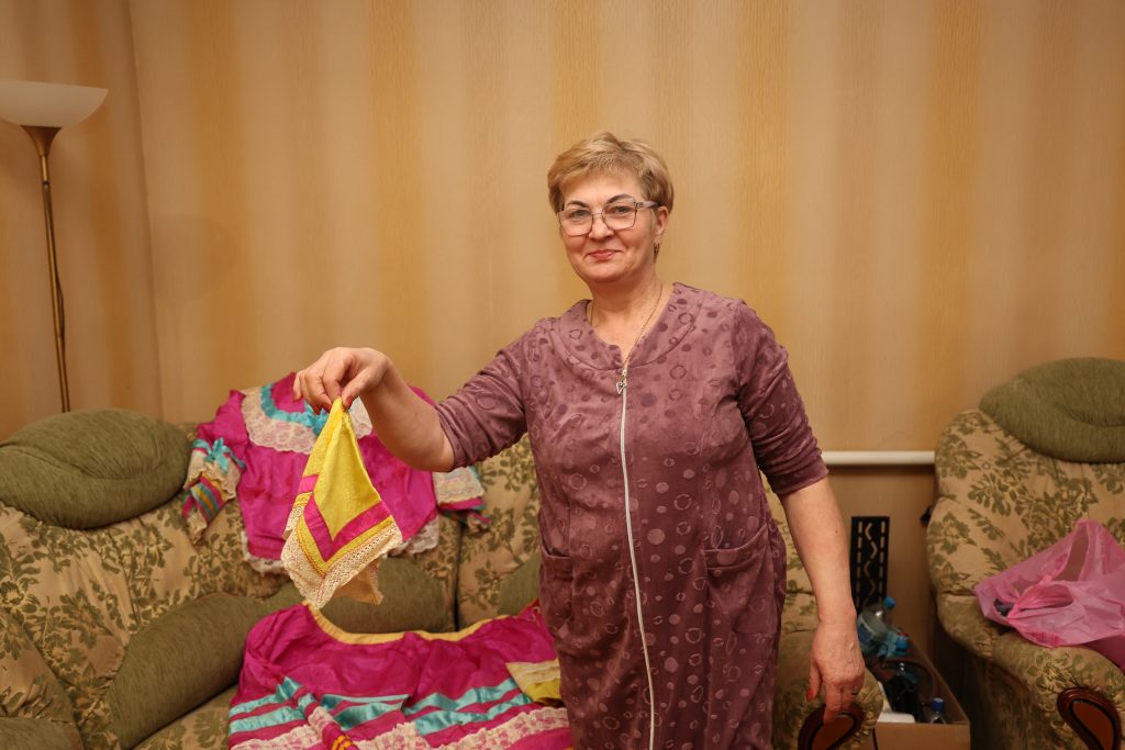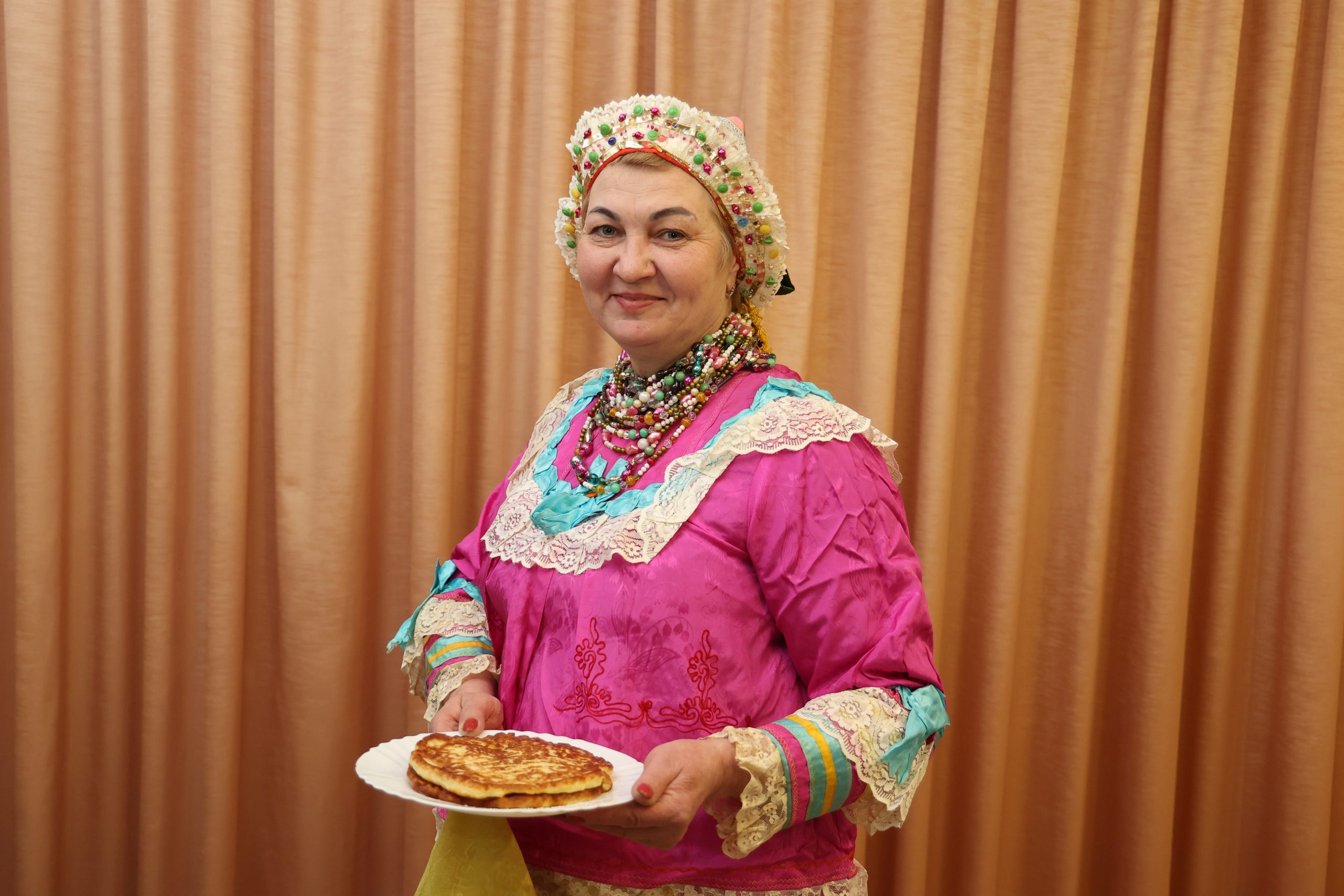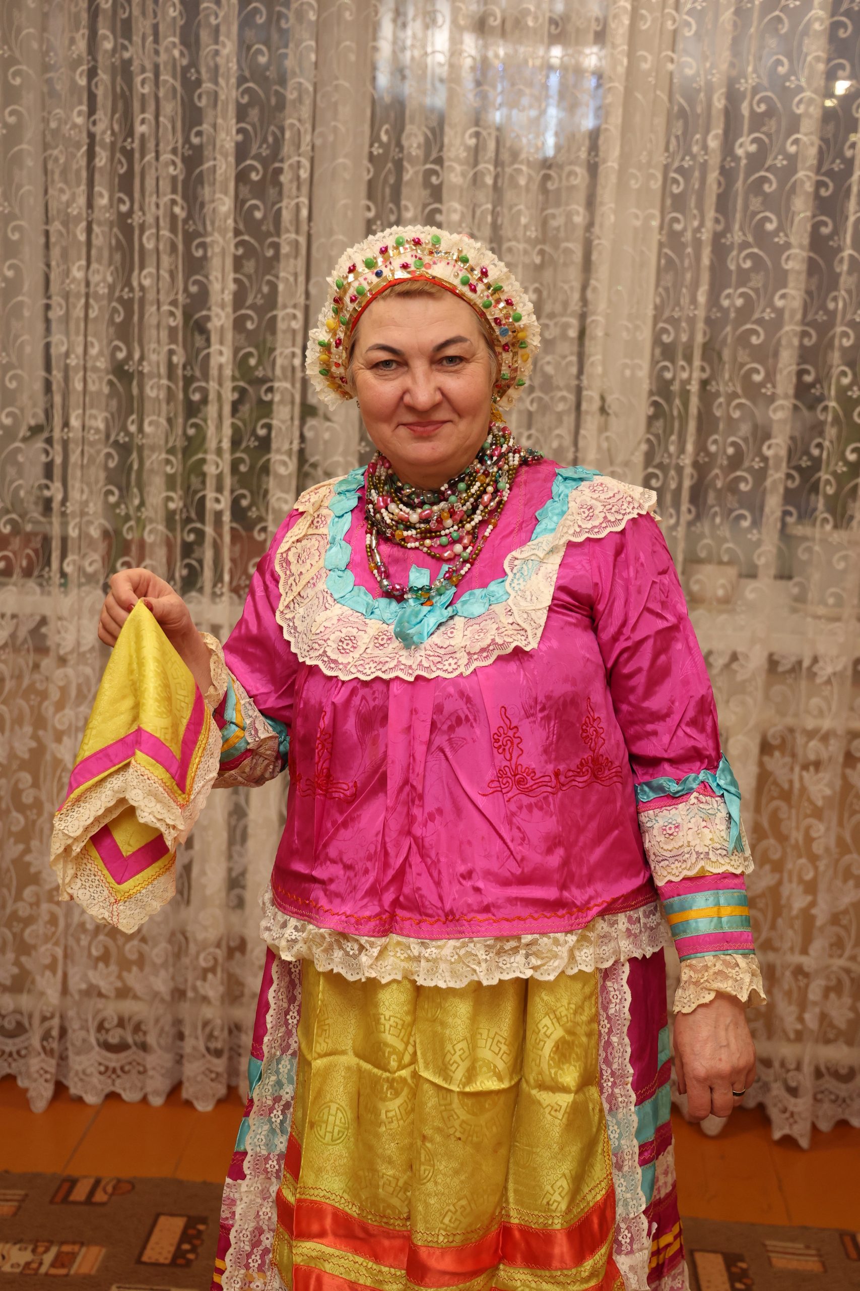 Хозяйка извлекает из домашнего «тайника» броского ярко-розового атласа юбку ниже колен и кофту. Наряд украшен лентами, тюлем. На жёлтом фартуке, который полагалось надевать поверх юбки, тоже нашиты ленты, кружевная ткань. На шею — положенная низка — связка блестящих бус, собранная из 5, а то и из 10 нитей. Волосы тщательно скрывали башлыком.