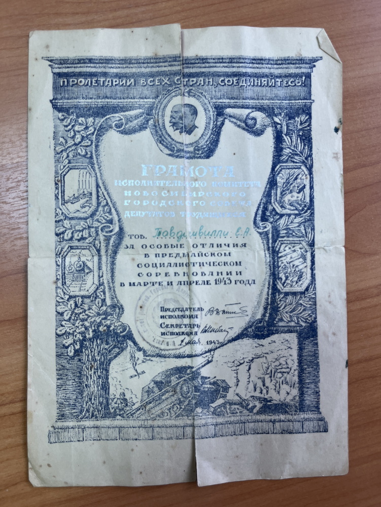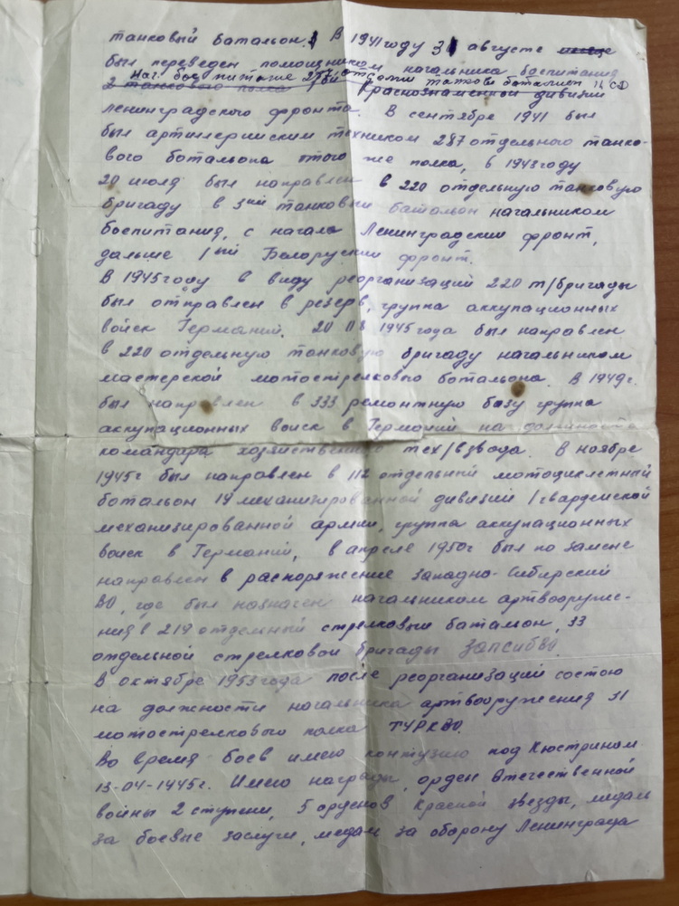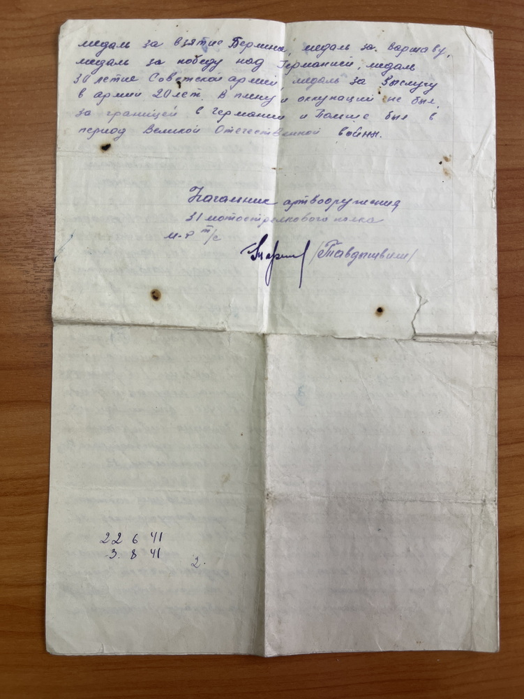 После дедушки у внучки (увы, ей не довелось лично общаться с ним) кроме воспоминаний мамы остались два ящика грамот, благодарностей, поздравительных адресов в честь важной даты или события. Да ещё рукою деда каллиграфически выписанная автобиография. Опять же, без подробностей воинской службы.