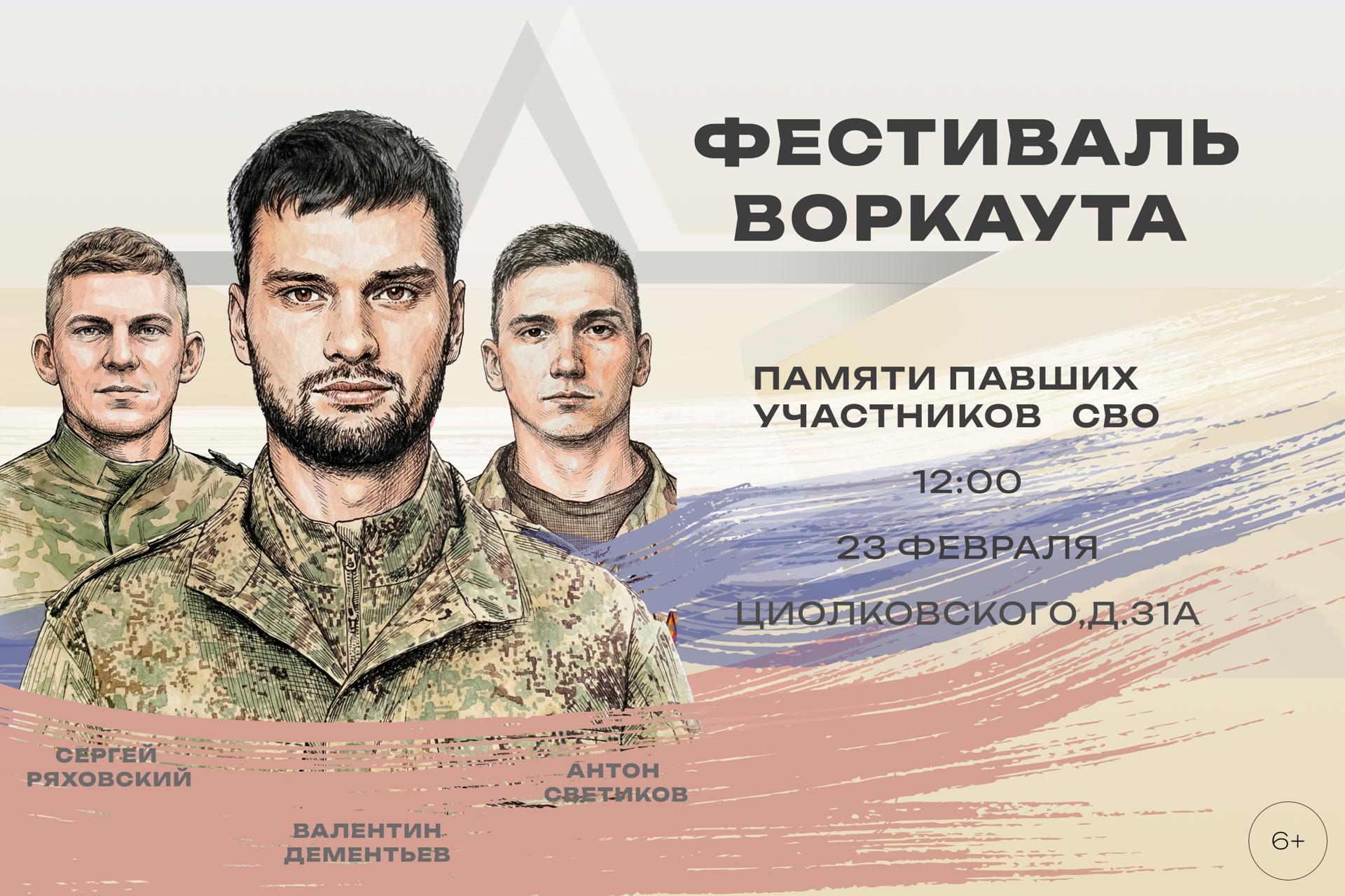 Фестиваль воркаута 6+, посвящённый памяти Валентина Дементьева, Антона Светикова и Сергея Ряховского пройдёт в Липецке 23 февраля. Липецкие спортсмены, бойцы, патриоты отдали жизнь за Родину и остаются примером для подрастающего поколения. Увлечение воркаутом объединяло их при жизни, теперь этот вид спорта стал данью уважения их мужеству.