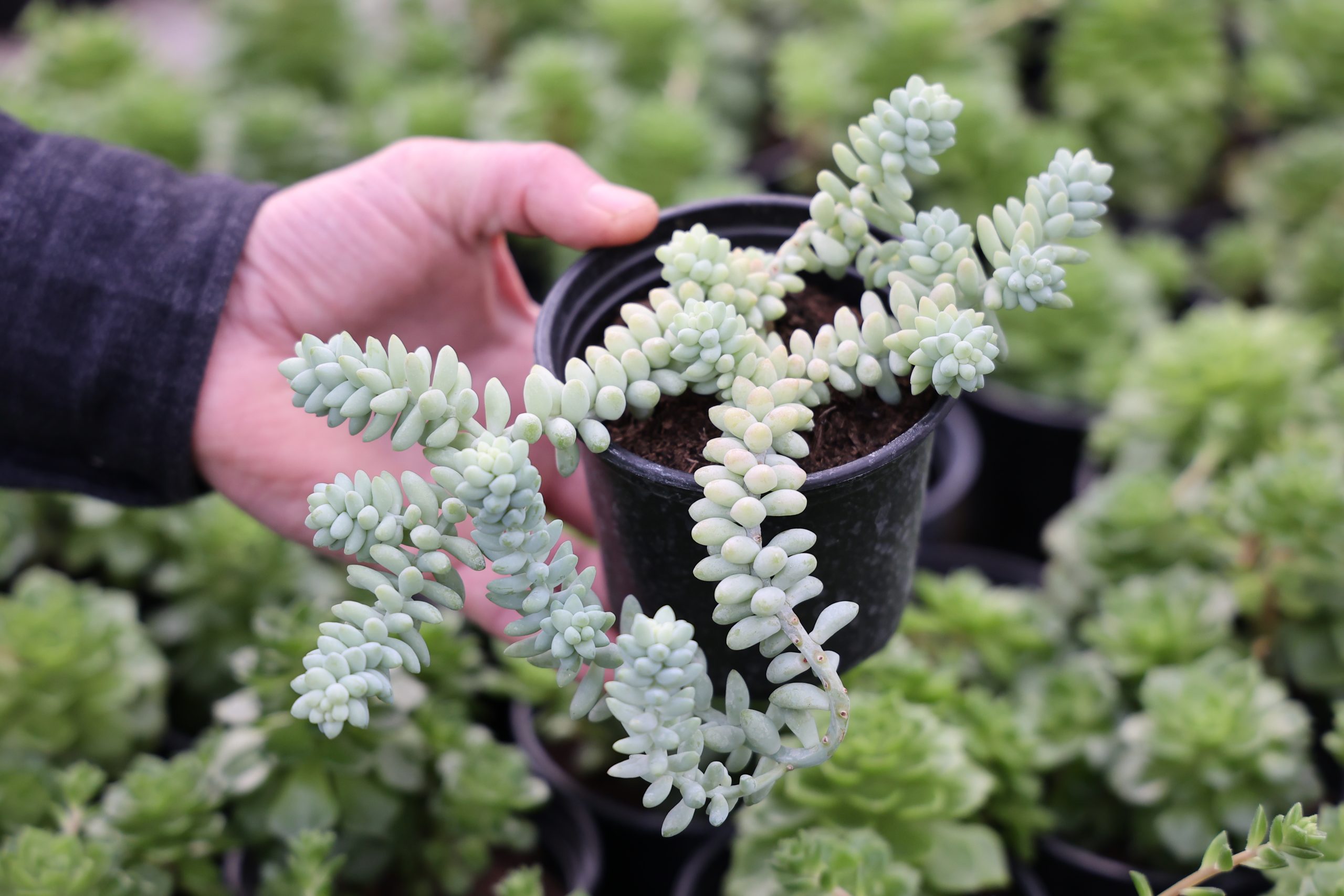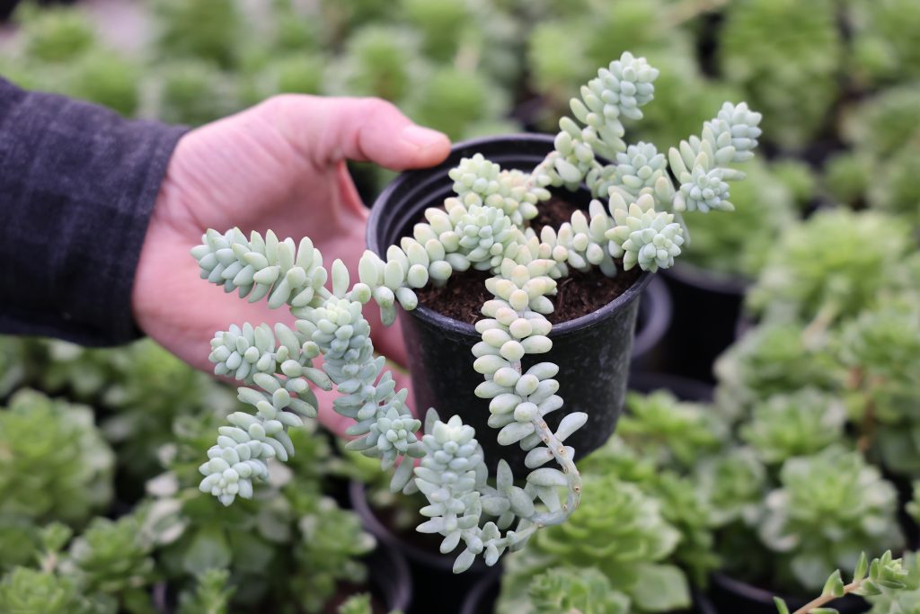 Пушистые серо-бирюзовые плети этого растения, свисающие из горшка, похожи на ветки кораллов. Ампельный суккулент — явление нечастое. Этот очиток сажают в подвесных кашпо, чтобы подчеркнуть красоту длинных стеблей, густо усыпанных мелкими мясистыми листьями — сочными, с красивым восковым налётом.
