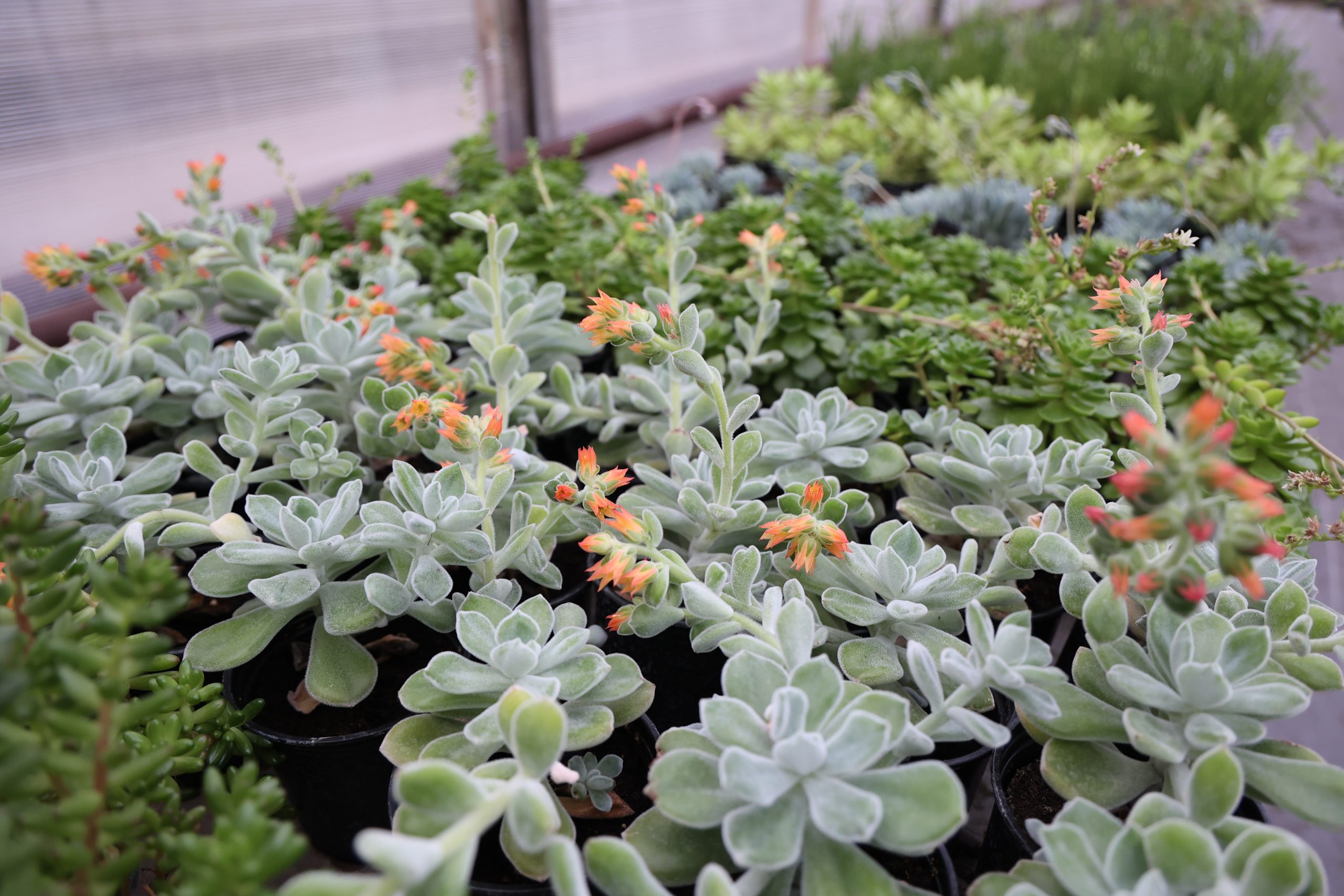На цветоносах, что торчат из каждого горшочка, — соцветия оранжевых, белых и розовых колокольчиков, собранных в гроздь. Хрупкая на вид красота на ощупь реально почти жёсткая. В дикой природе эхеверия ворсистая растёт в Перу, Мексике и южных штатах США.
