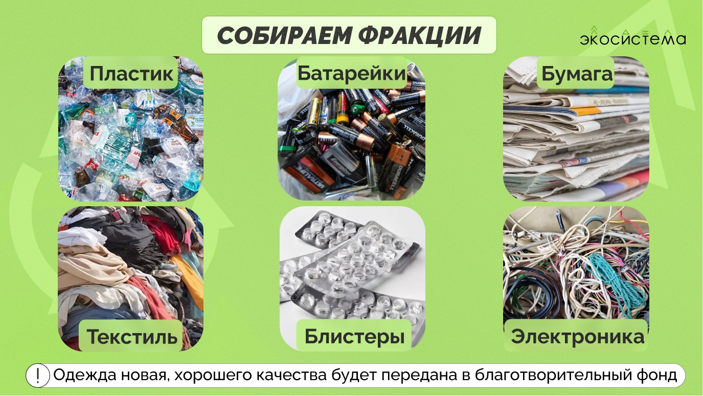 Жители города смогут сдать в переработку пластик, ткани, бумагу, старую или неисправную технику, блистеры от таблеток, батарейки. Участников просят вещи в хорошем состоянии собирать отдельно, их могут передать в благотворительные организации.