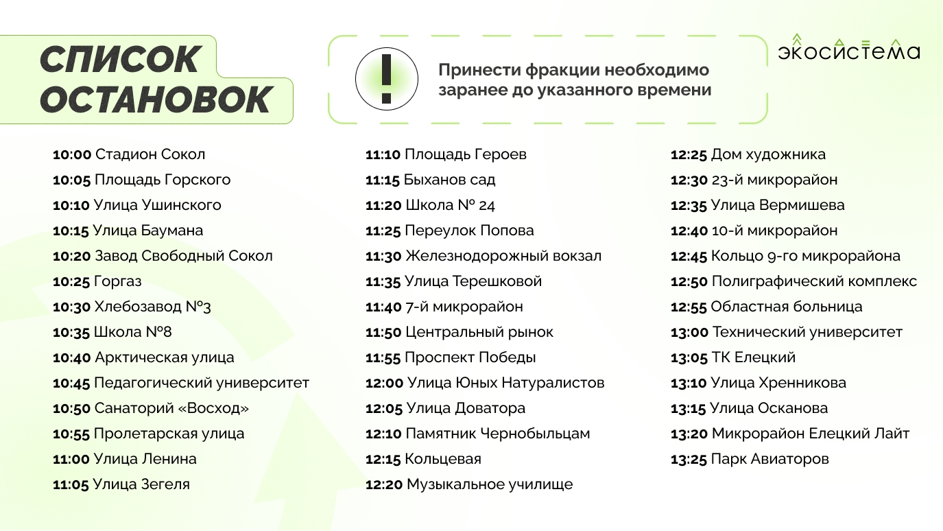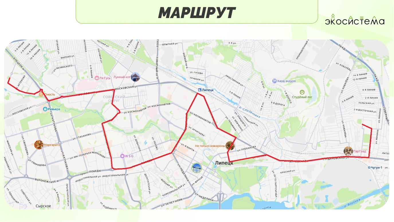 Организаторы отмечают, что субботний рейс сделает 41 остановку с 10:00 (отправление от стадиона «Сокол») и конечной в 13:25 (в микрорайоне «Елецкий» у парка «Авиаторов»).