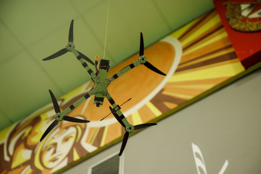 Эти гонки напоминают воздушную «Формулу-1». На учебном дроне «Тинивуп» юные операторы БПЛА отрабатывают навыки пилотирования мультироторного типа. Плавный взлёт — и мини-квадрокоптер звонко жужжит над самой головой. «Птичка» с электронным блоком управления и FPV-оборудованием — идеальный вариант для учебных гонок в зале.