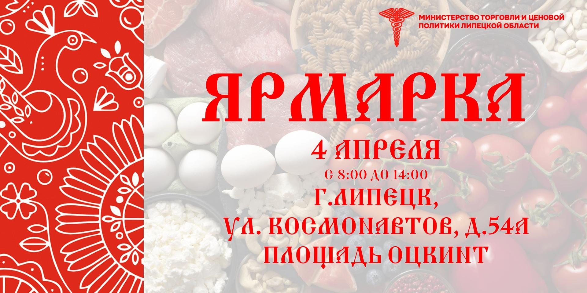 В предстоящую субботу, 4 апреля, с 8 до 14 часов в Липецке будет проходить большая ярмарка, информирует Министерство торговли и ценовой политики по региону. Торговые ряды развернутся на площади у ОЦКНТиК по адресу улица Космонавтов, дом 54 А.