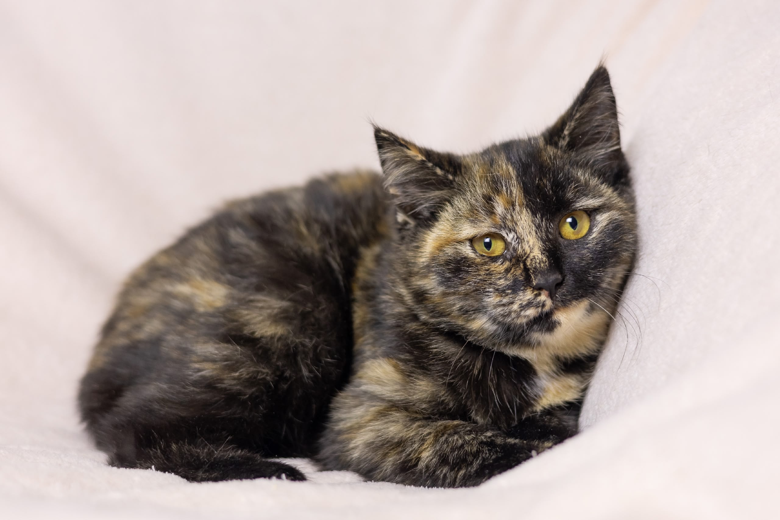 Особая история: осторожная и добрая барышня с набивной шубкой. Любит полежать на коленках и помурлыкать, когда её гладят. Очень спокойная. В еде непривередлива.