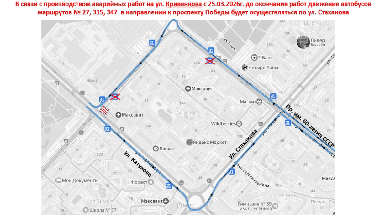 ул. Катукова – ул. Стаханова – пр. 60 лет СССР – далее по маршрутам