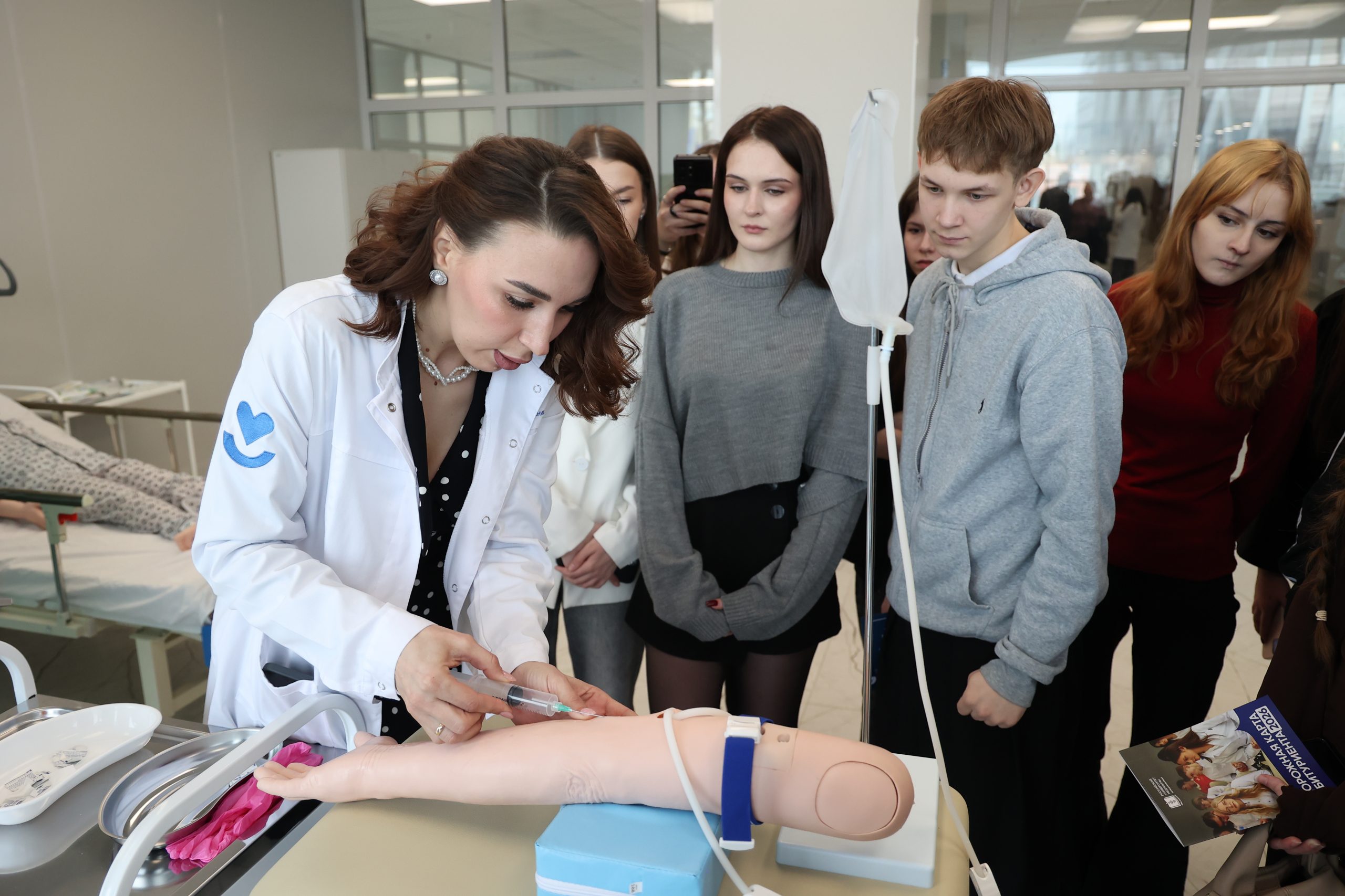 Ощутить учебный процесс смогли все желающие: распахнутые двери аудиторий приглашали поучиться на манекенах-тренажёрах делать уколы, брать кровь из вены, накладывать швы, а также получить азы оказания первой медицинской помощи — всё под бдительным инструктажем опытных медиков.