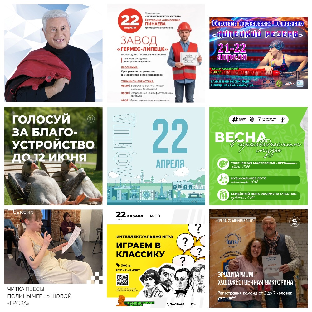 🔸09:30-12:30 — бесплатная экскурсию на завод «Гермес-Липецк» 12+. Организатор — депутат городского Совета, председатель «Клуба городского жителя» Екатерина Алексеевна Пинаева. Запись до 18:00 19 апреля по телефону: +7 (903) 028-03-14.