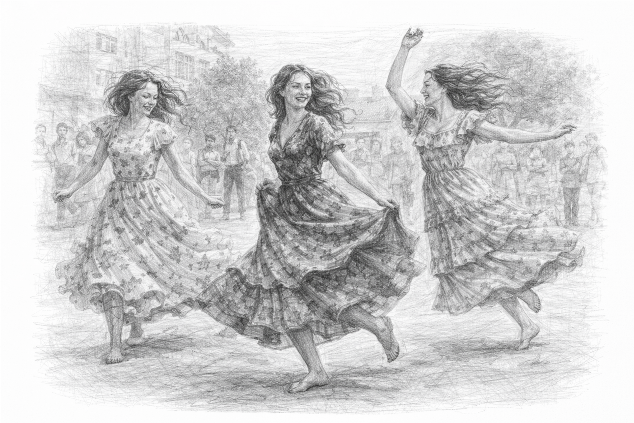 Рядом с ними кружились улыбчивые девушки в пёстрых платьях и с точками в межбровье. Они танцевали и раздавали прохожим сладости.