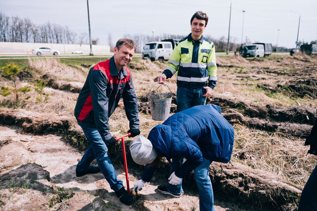Корреспонденты, фотографы, редакторы, сотрудники административных отделов и директор высаживали сосны вдоль Грязинской трассы.