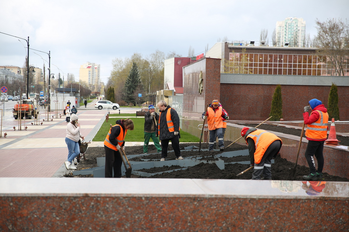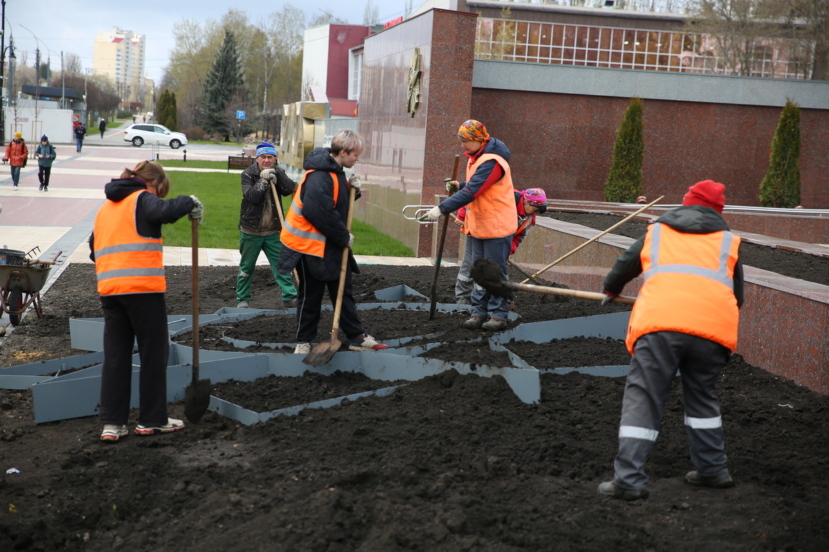 Здесь же неподалёку сегодня трудятся и сотрудники «Зеленхоза». Они обустраивают центральную цветочную композицию в памятном месте. Специалисты тщательно подготавливают грунт, чтобы совсем скоро клумба в форме звезды расцвела яркими красками.