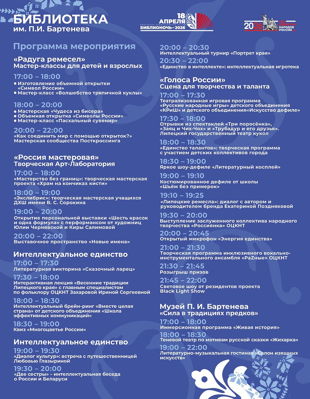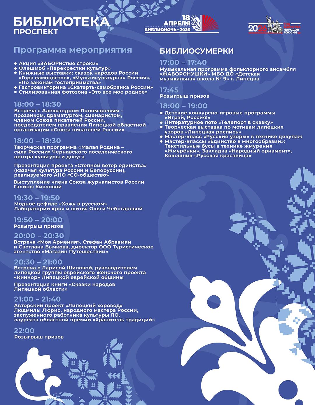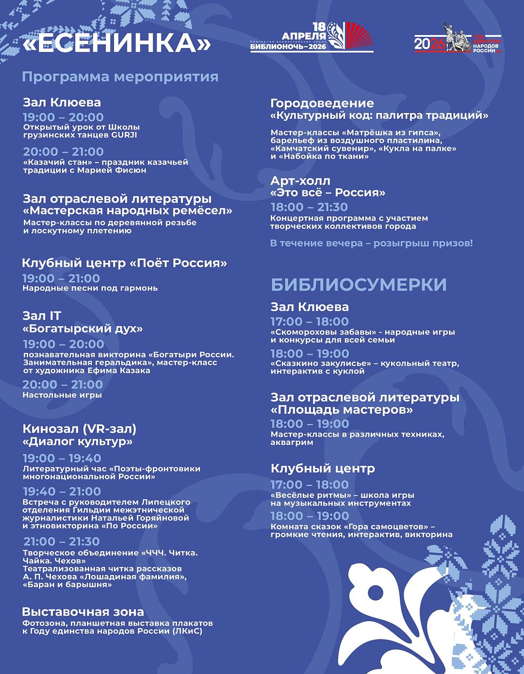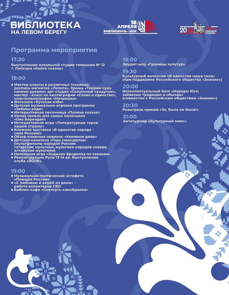 — «Библионочь» (12+) — это прекрасная возможность не только насладиться чтением, но и глубже познакомиться с многообразием культур и литературных традиций народов России, — рассказали в Централизованной библиотечной системе о предстоящих мероприятиях. — Гостей ждут интерактивные программы, творческие мастер-классы, выступления талантливых артистов, увлекательные розыгрыши призов и множество других сюрпризов. Атмосфера обещает быть по-настоящему праздничной, шумной и весёлой.